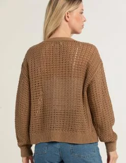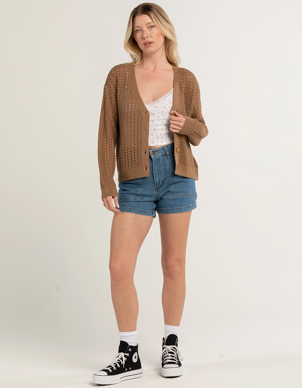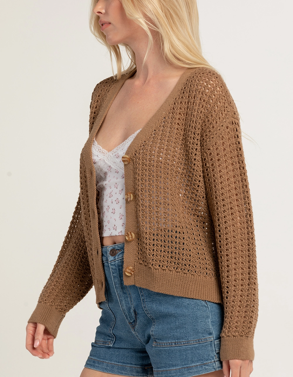 RSQ Open Weave Cardigan. V-neckline. Button front. Rib cuffed long sleeves and hem. Slightly cropped fit with a hem that hits at the hip. 100% Acrylic. Machine wash. Imported.