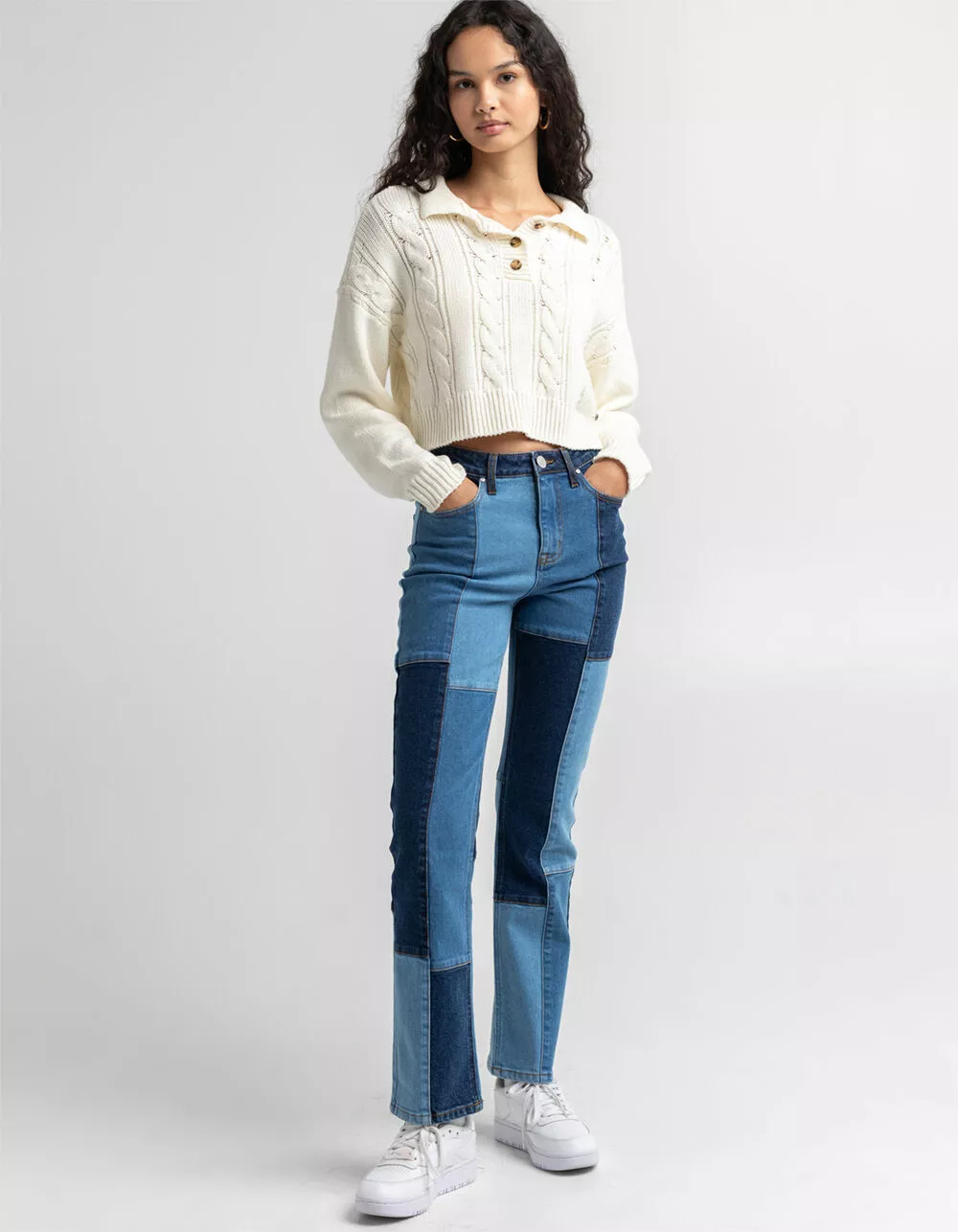 RSQ Womens Patchwork Jeans. Belt loop waist. Button closure paired with zipper fly. Multiple washed denim patches. Basic 5 pocket design. Approx. inseam: 29.5″. 99% Cotton 1% spandex. Machine wash. Imported.