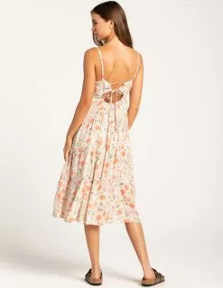 RSQ Print Tier Midi Dress. Allover floral print. Scoop neckline. Tie closure at back. Adjustable spaghetti straps. Tiered dress. Built-in lining. Loose and flowy fit. Approx. length: 42.5”. 100% Rayon. Machine wash. Imported.