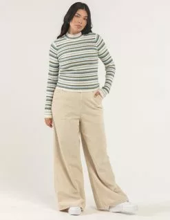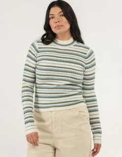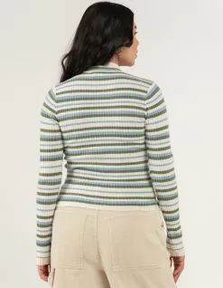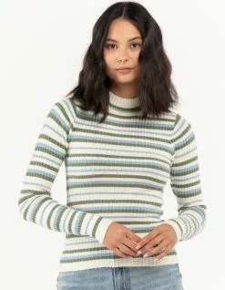 RSQ Rib Striped Mock Neck Pullover Sweater. All of stripe pattern. Stretchy ribbed construction. Long sleeves. Mock neck. Fitted silhouette. 50% Viscose 30% Polyester 20% Nylon. Machine wash. Imported.