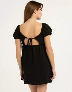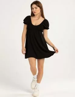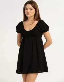 RSQ Smock Bodice Babydoll Dress. Scoop neckline. Smocked bodice. Puff short sleeves with ruffle hem. Partial open back with back tie closure. Elastic waist. Approx. length: 33”. 100% Polyester. Machine wash. Imported.