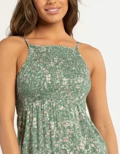 RSQ Smock Midi Dress. Allover floral print. High neckline. Smocked bodice. Tiered skirt. Approx. length: 44.5”. 100% Rayon. Machine wash. Imported.