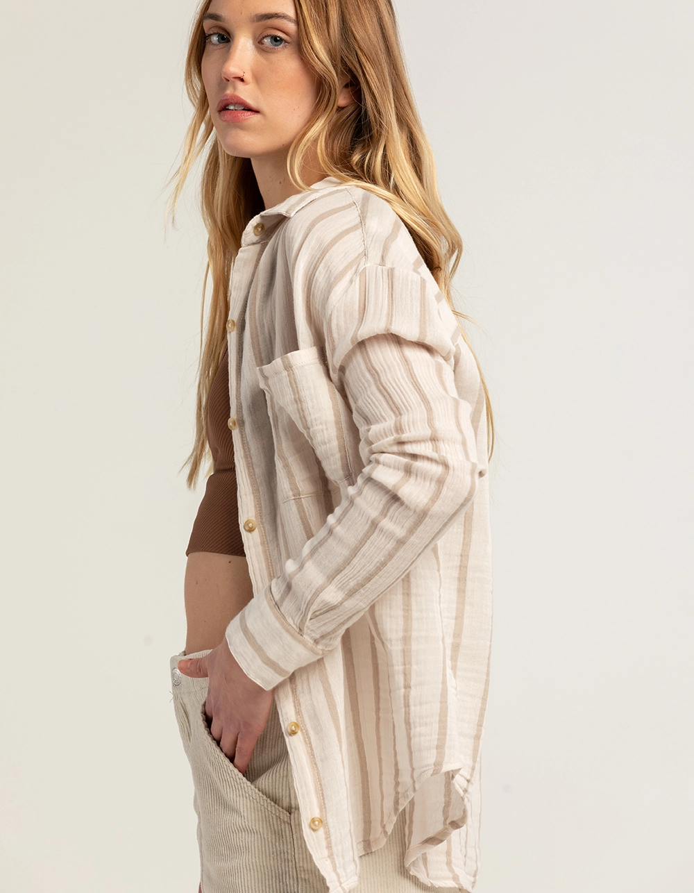 RSQ Stripe Gauze Boyfriend Shirt. Allover stripe print. Button down front. Flat collar. Chest patch pocket. Button cuffed long sleeves. Curved hem. Loose fit. 100% Cotton. Machine wash. Imported.