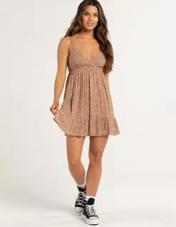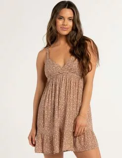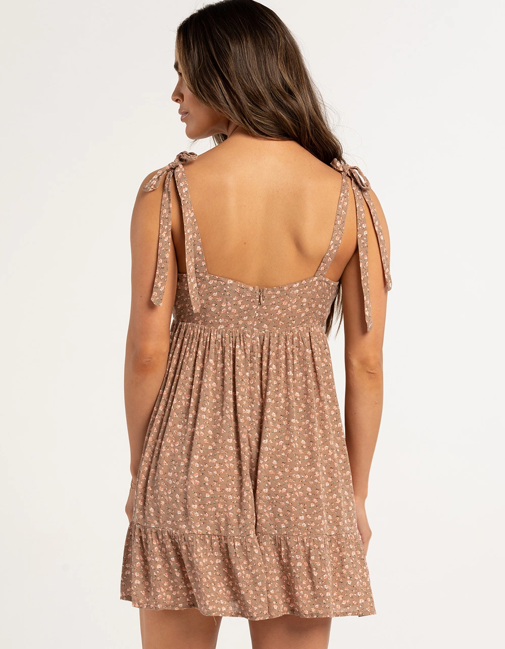 RSQ Surplus Babydoll Dress. Allover floral print. V-neckline. Double lined bust. Zipper closure at back. Self tie shoulder straps. Approx. length: 32”. Self: 100% Rayon. Lining: 100% Polyester. Machine wash. Imported.