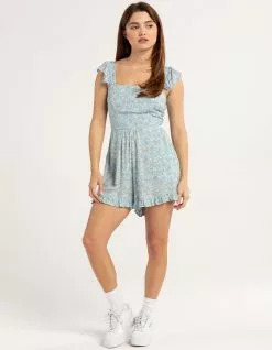 RSQ Tie Back Romper. Allover floral print. Straight neckline. Partial open back with back ties. Fixed shoulder straps with ruffle trim. Ruffle hem. Elastic waist. Approx. inseam: 3”. Self: 100% Rayon. Lining: 100% Polyester. Machine wash. Imported.
