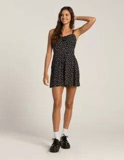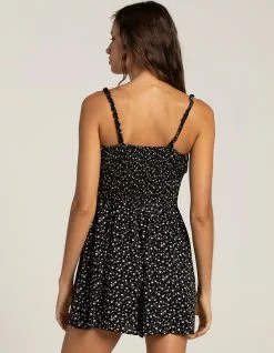 RSQ Tie Front Romper. Allover floral print. Scoop neckline with tie fixture. Faux button front at chest. Elastic spaghetti straps with ruffle detailing. Smocked back. Approx. inseam: 3”. 100% Rayon. Hand wash. Imported.