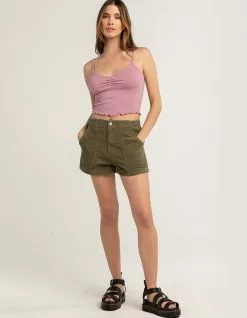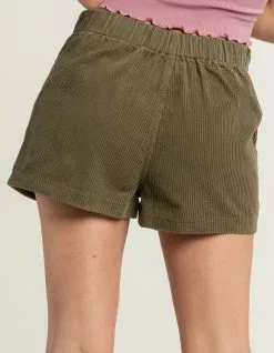RSQ Utility Corduroy Shorts. Button closure paired with zipper fly. Slant hand pockets. Seam details. Corduroy fabrication. Elastic waistband. 100% Cotton. Hand wash. Imported.