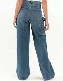 RSQ Wide Leg Carpeneter Jeans. Belt loop waist. Button closure paired with zipper fly. Traditional 5 pocket design. Carpenter loop and pockets on right mid leg. Wide leg fit. Approx. inseam: 33.5″. 99% Cotton 1% Spandex. Machine wash. Imported.