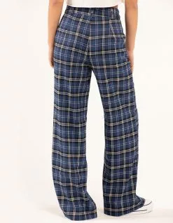 RSQ Wide Leg Plaid Pants. All over plaid. Belt loop waist. Button front waist. Zip fly. Wide leg fit. Approx. Inseam 32″. 65% Polyester 30% Rayon 5% Spandex. Hand machine. Imported.