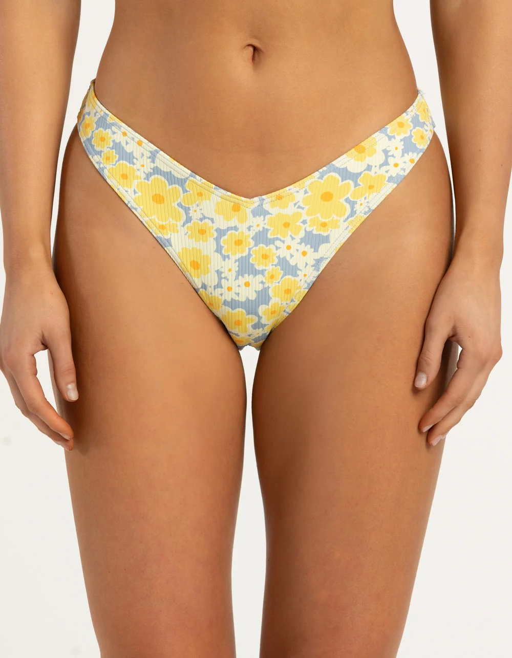 RVCA Freya V French Skimpy Bikini Bottoms. Allover floral print and ribbed texture. V-shaped waistline. High leg cut. Skimpy coverage. 84% Polyamide, 16% Elastane. Hand wash. Imported.