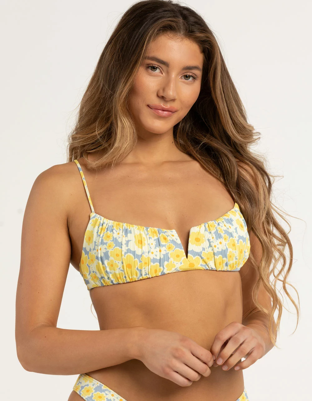 RVCA Freya V Wire Bikini Top. Allover floral print and ribbed texture. V-neckline. Adjustable spaghetti straps. Adjustable hook closure at back. Removeable bra pads. 84% Polyamide, 16% Elastane. Hand wash. Imported.