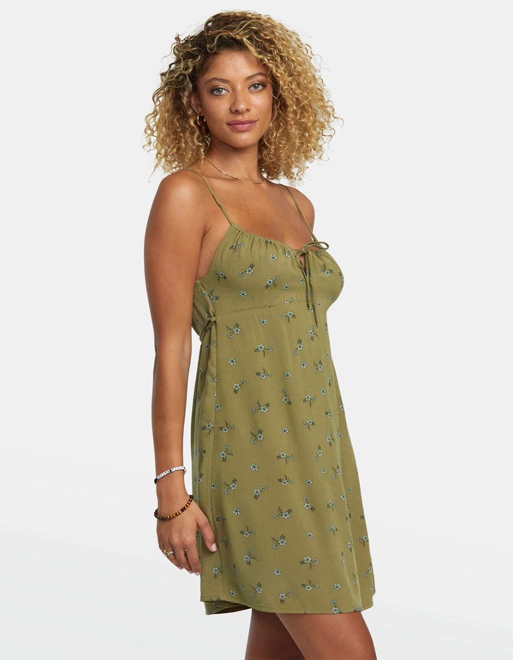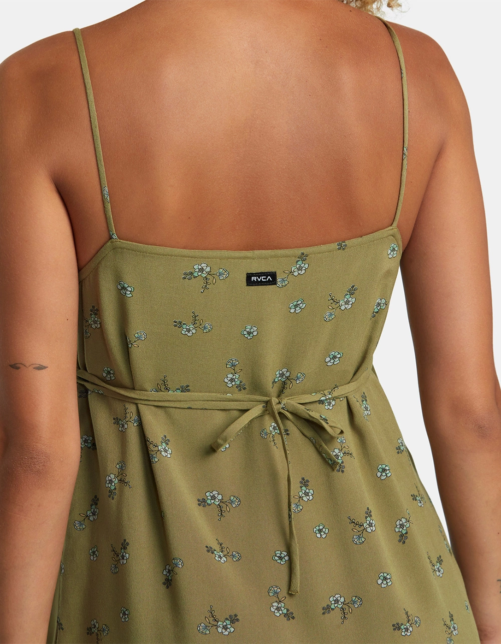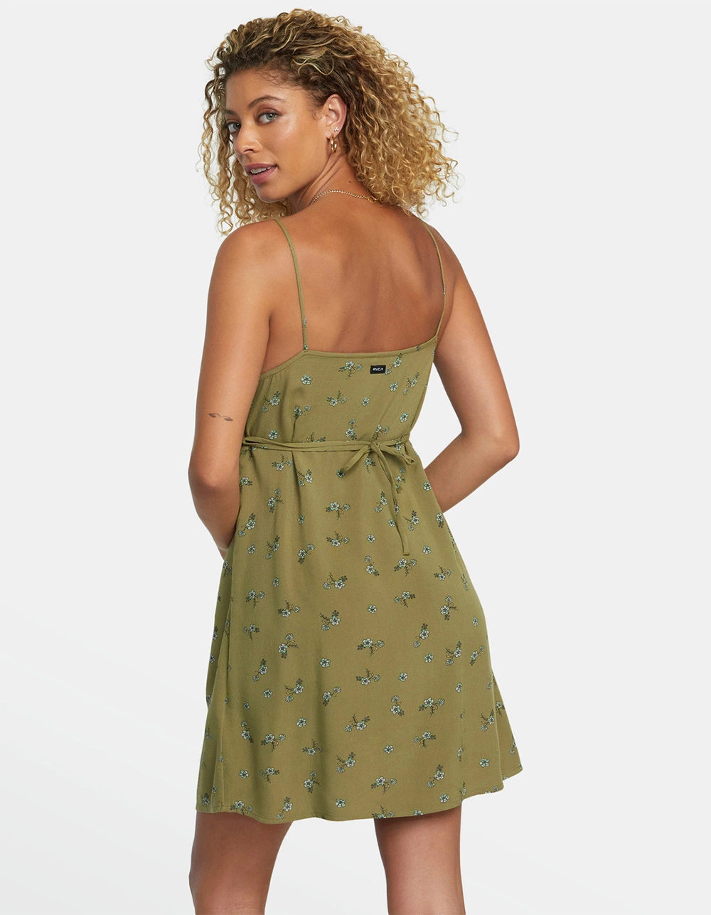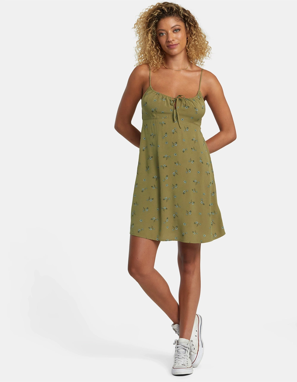 RVCA Hillside Mini Dress. Allover print. Fitted. Tie at neckline. Adjustable straps. Empire waist. 100% Viscose. Imported.