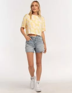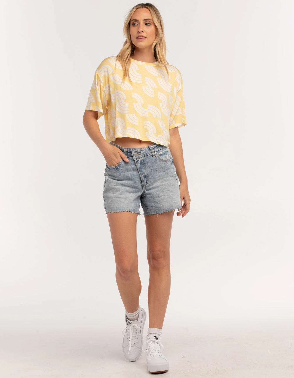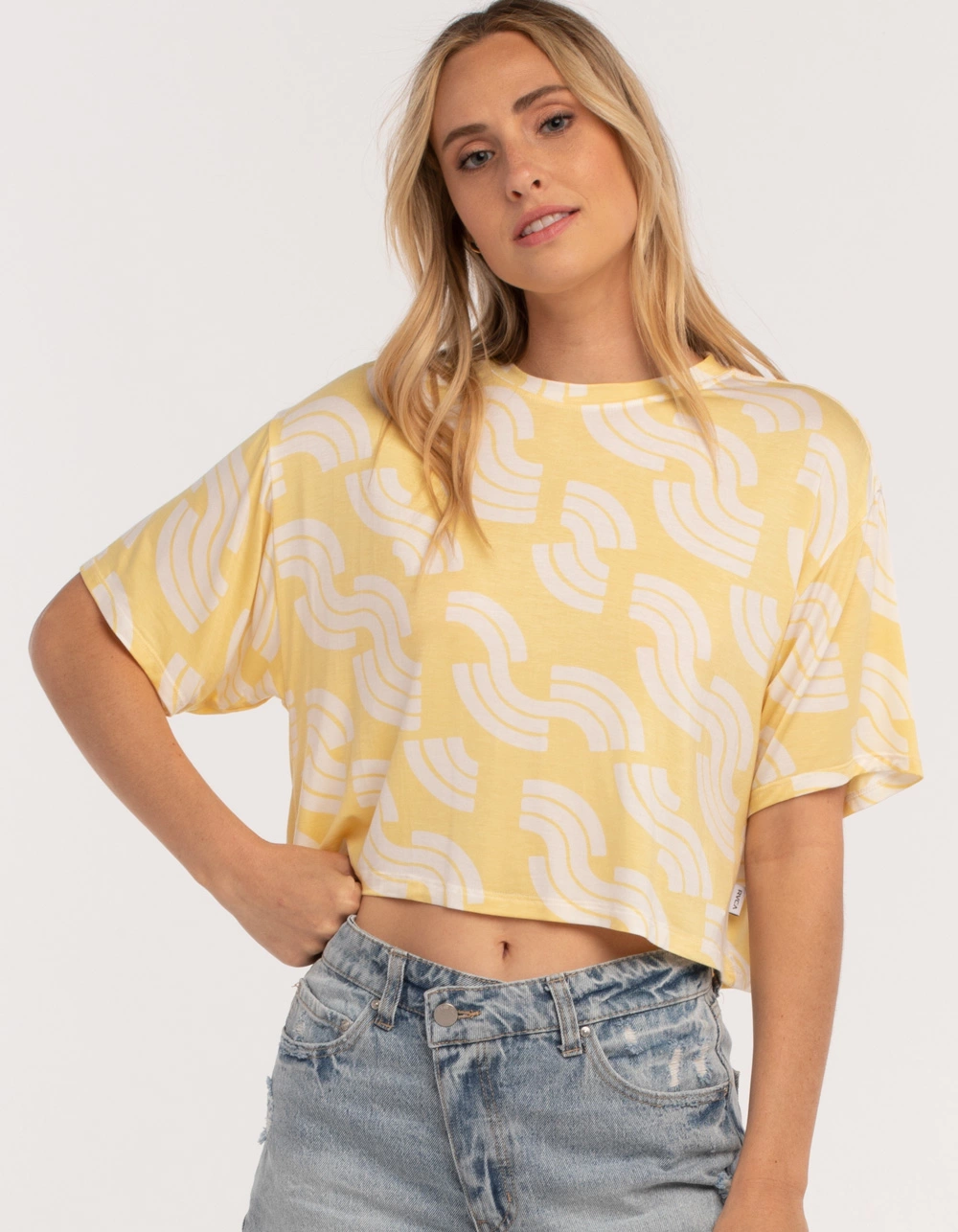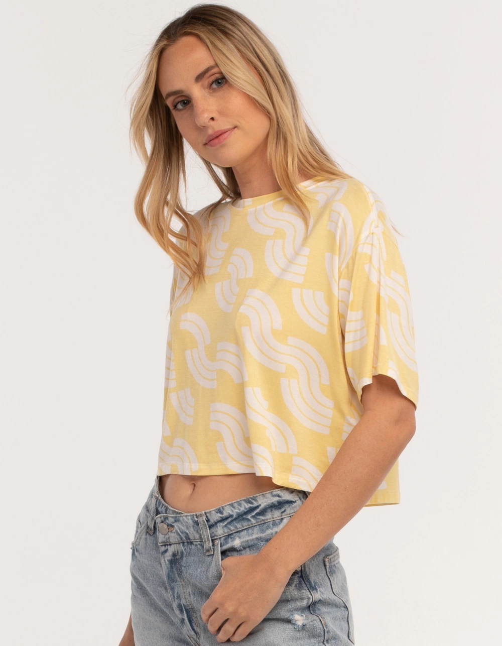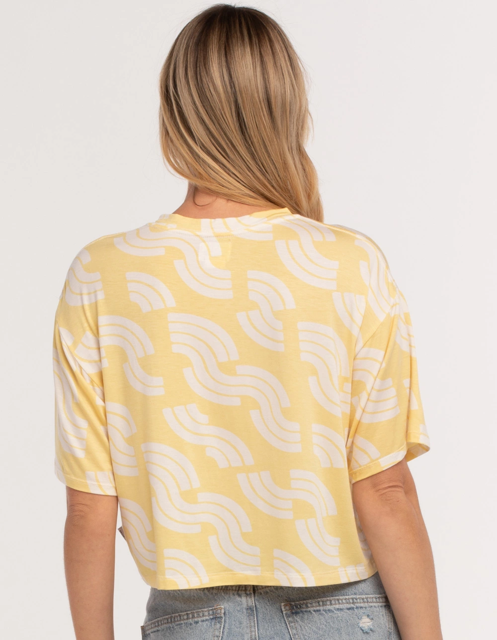 RVCA Hooky Tee. All over Pattern. Crop hem. Boxy stretchy fit. Crew neckline. Short Sleeves. 94% Modal 6% Elastane. Machine wash. Imported.