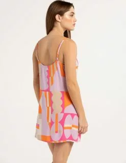 RVCA Jesse Brown Dress. Allover vibrant and abstract print.. V-neckline. Adjustable spaghetti straps. Side slit. Approx. length: 32”. 100% Viscose. Machine wash. Imported.