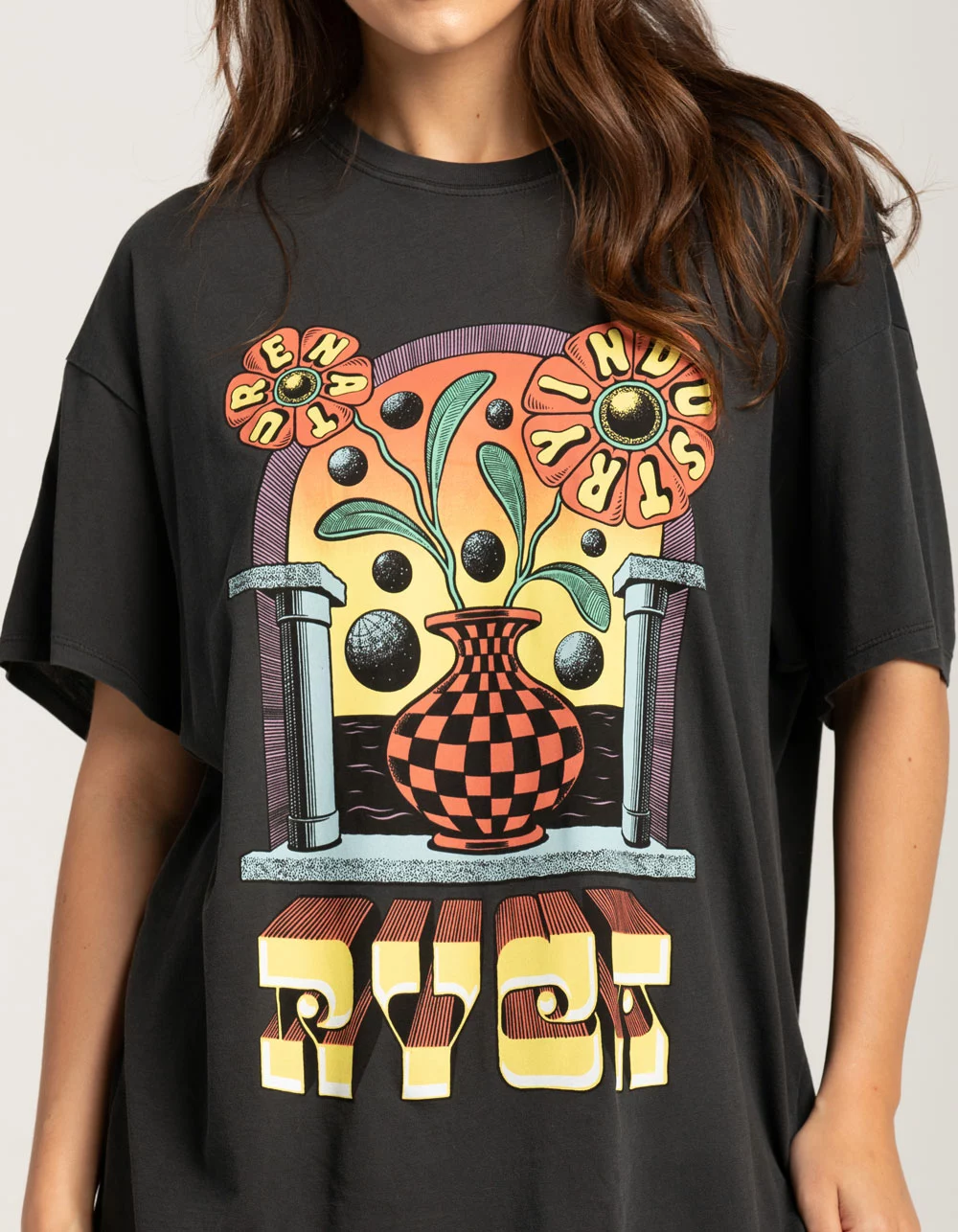 RVCA Portal Oversized Tee. Large graphic screened on front. Ribbed crew neckline. Short sleeve. Lightweight material. Oversized fit. 100% Cotton. Machine wash. Imported.