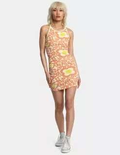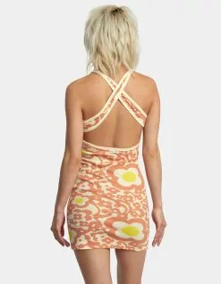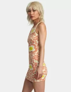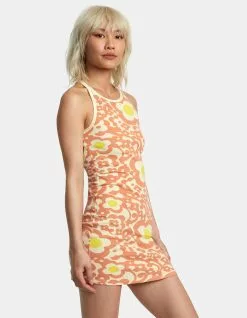 RVCA Stunner Sleeveless Rib Knit Dress. Made of ribbed knit blend fabric, this printed bodycon mini dress has a high scoop neck and an eye-catching open back with crisscross straps. A stunner, indeed. Crew neck with binding. Cross back straps. 57% Cotton 5% Elastane 38% Polyester. Imported.