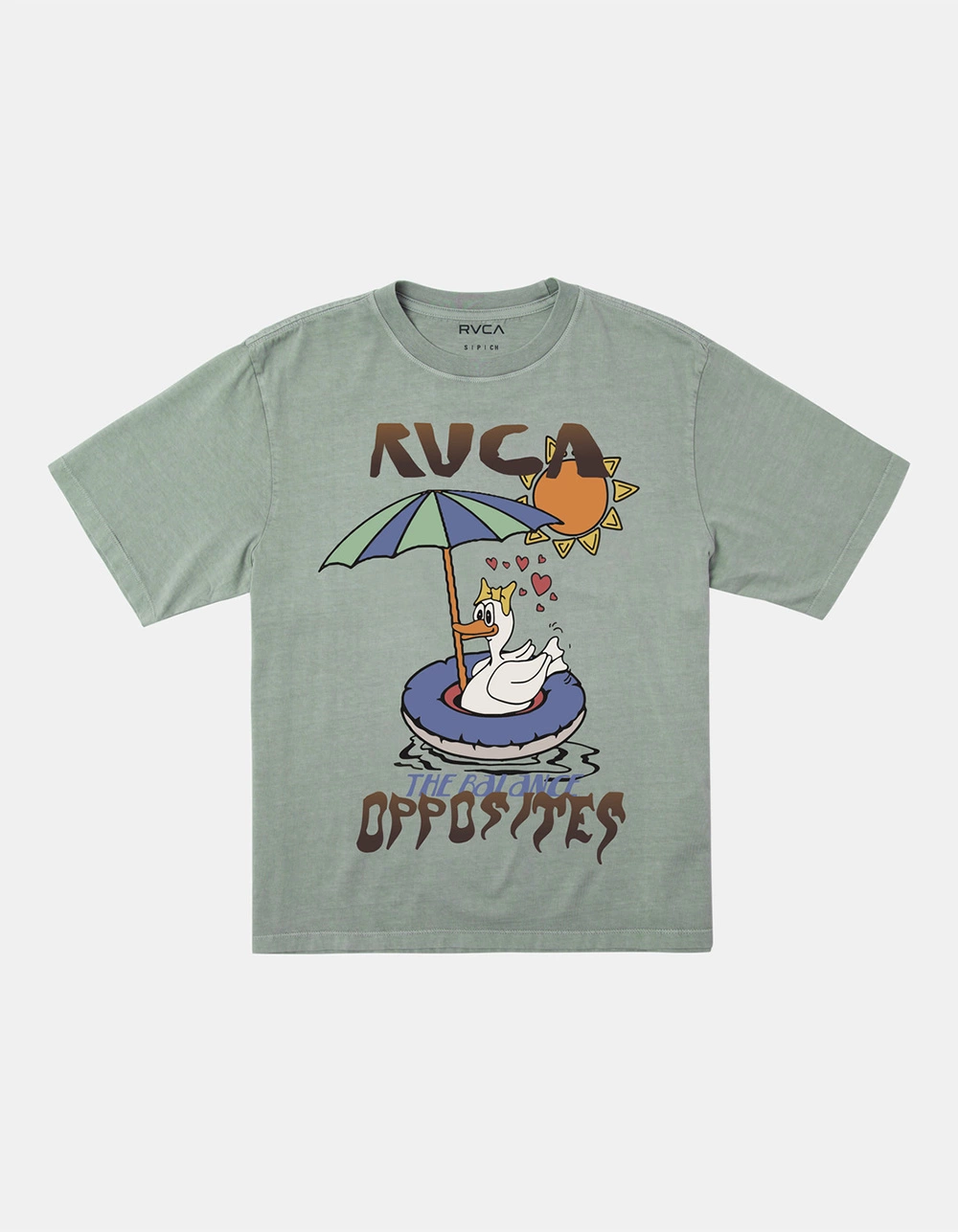 RVCA Sun Baked Oversized Tee. The Sun Baked t-shirt is crafted of organic cotton jersey and features signature RVCA artwork on the front. Pigment dyed to give it a well-worn look, this oversized tee is a perfect way to refresh your warm-weather essentials. Oversized fit. Crew neck. Short sleeve. 100% Organic Cotton. Machine wash. Imported.