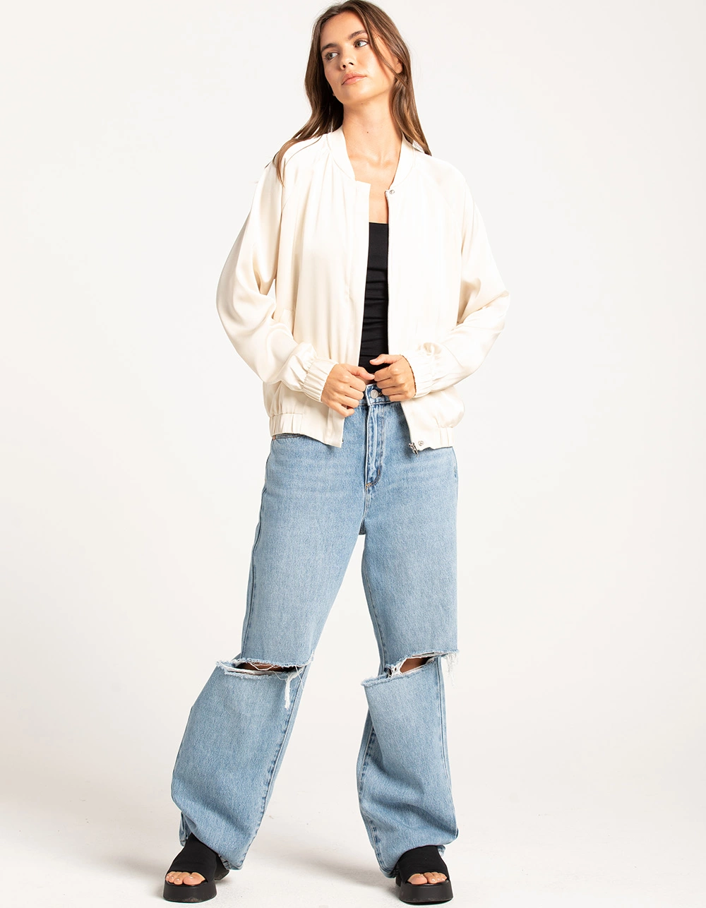 Sadie & Sage Satin Bomber Jacket. Zip front with snap button closures. Stretch rib knit collar. Elastic cuffed long sleeves and hem. Front welt pockets. Self: 96% Polyester, 4% Spandex. Contrast: 100% Cotton. Lining: 92% Polyester, 8% Spandex. Hand wash. Imported.