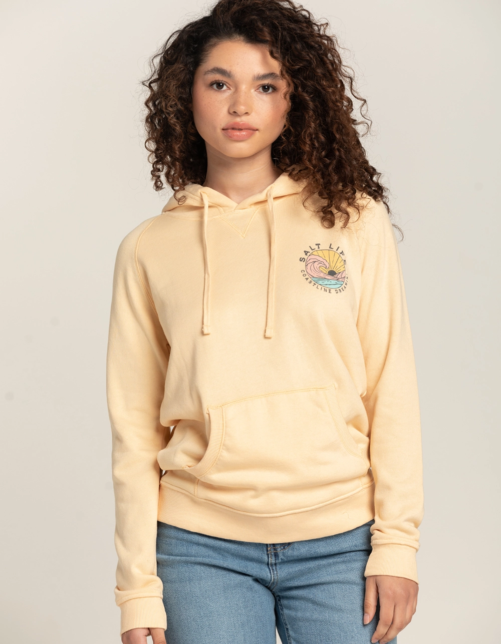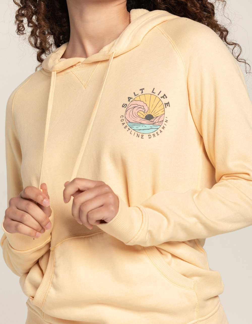 Salt Life Coastline Dreamin Hoodie. Logo graphic screened on left chest. Large graphic on back. Drawstring hood. Kangaroo pocket. Cuffed long sleeves and hem. Fleece lining. 60% Cotton, 40% Polyester. Machine wash. Imported.