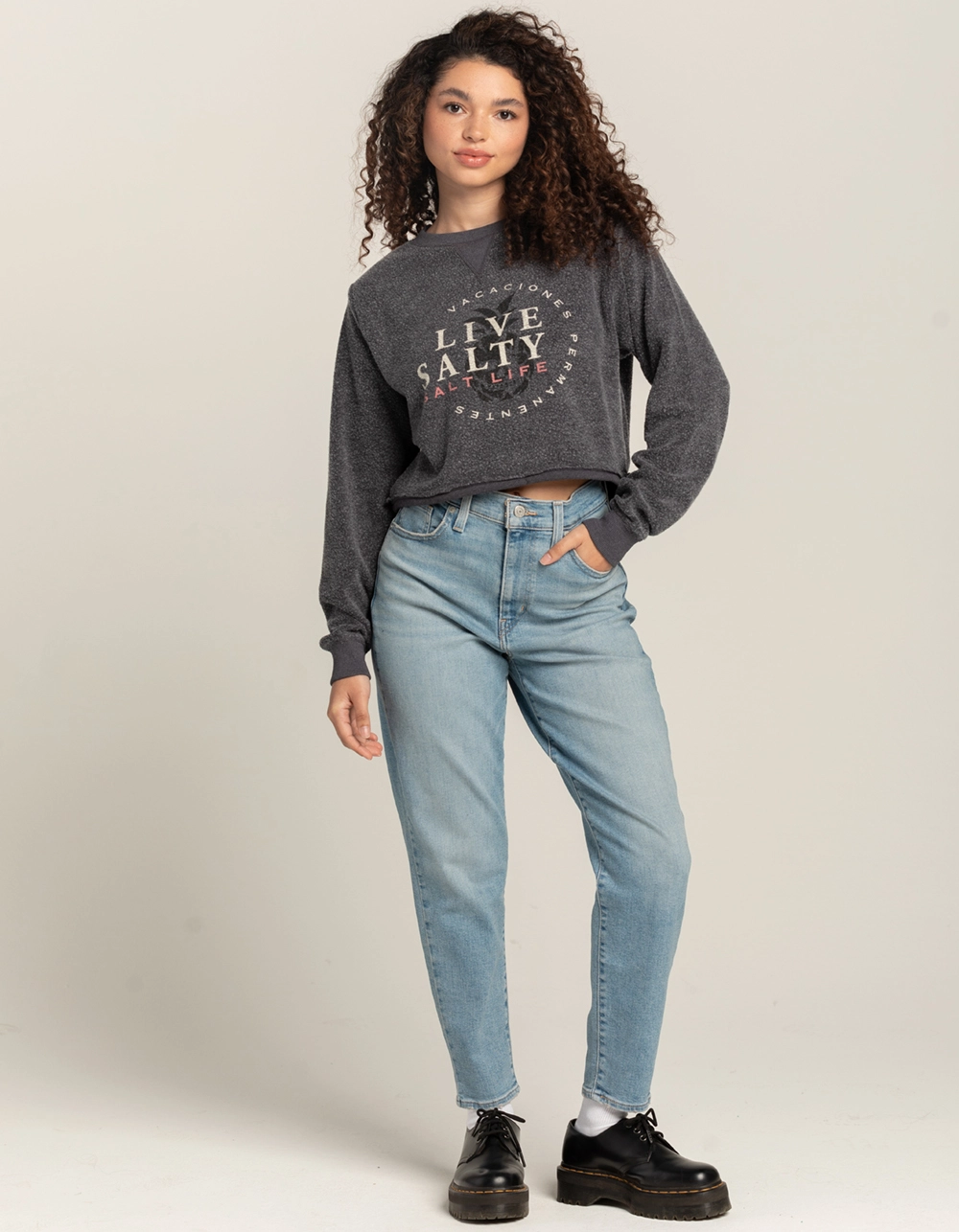 Salt Life Crop Fleece Sweatshirt. Graphic screened on front. Ribbed crew neckline. Cuffed long sleeves and hem. Salt Life clamp label on back hem. Cropped fit. 60% Cotton, 40% Polyester. Machine wash. Imported.