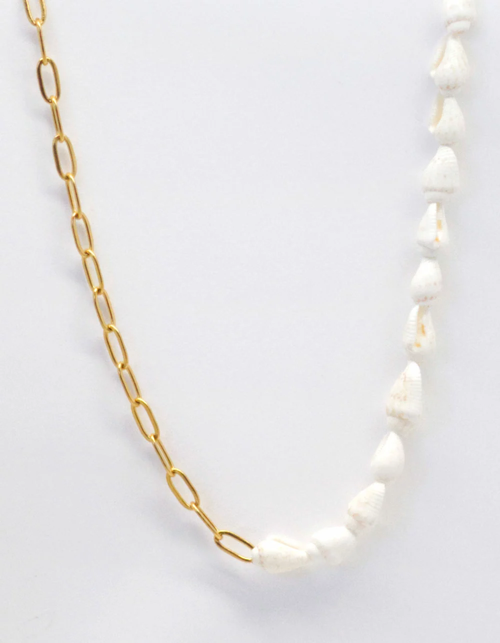 Salty Cali Paloma Shells Necklace. Half paperclip, half shells, this brand new necklace is everything you were looking for rolled into one pretty piece! Water friendly, gold plated stainless steel. Length: 16″ plus 2″ extender. Imported.