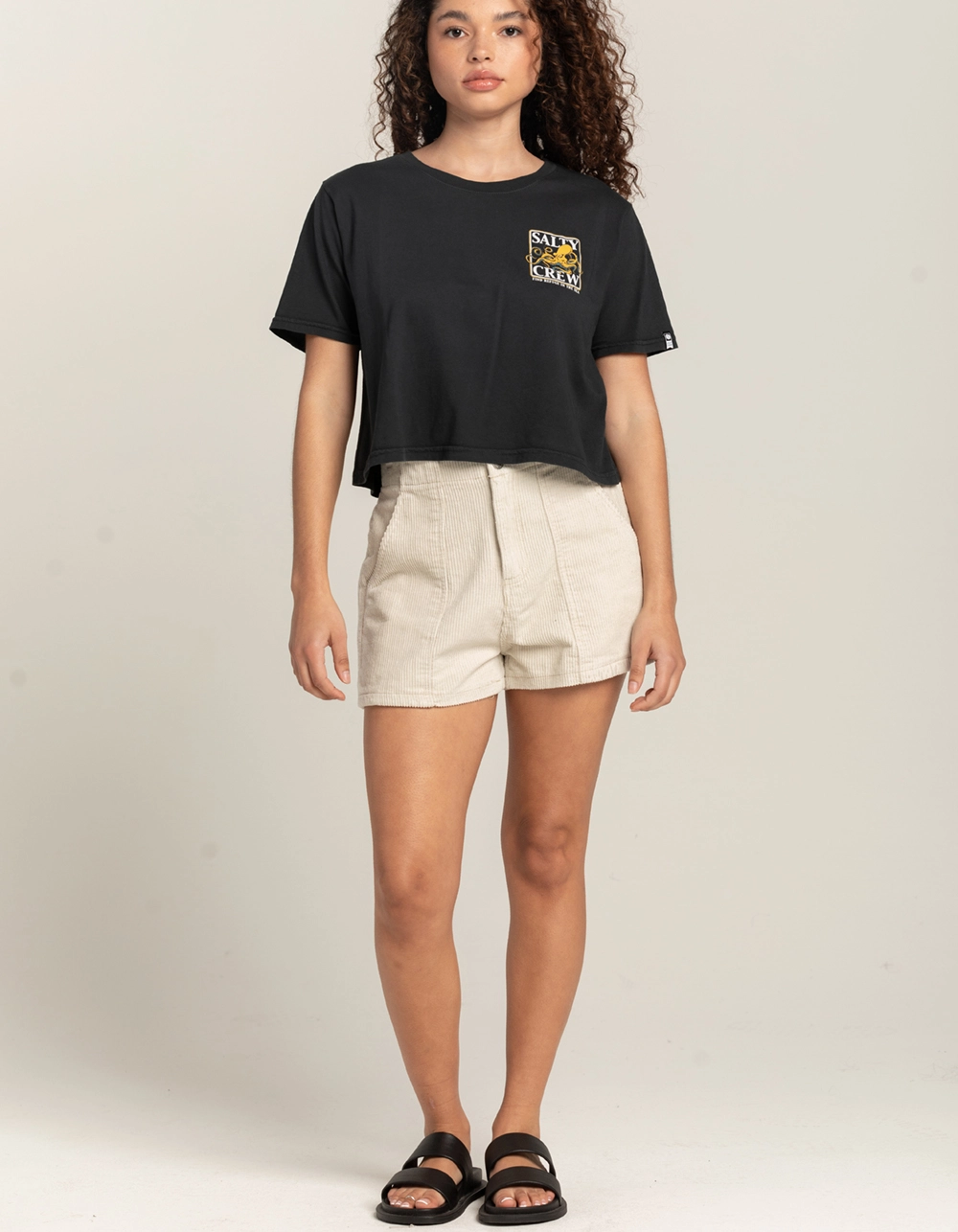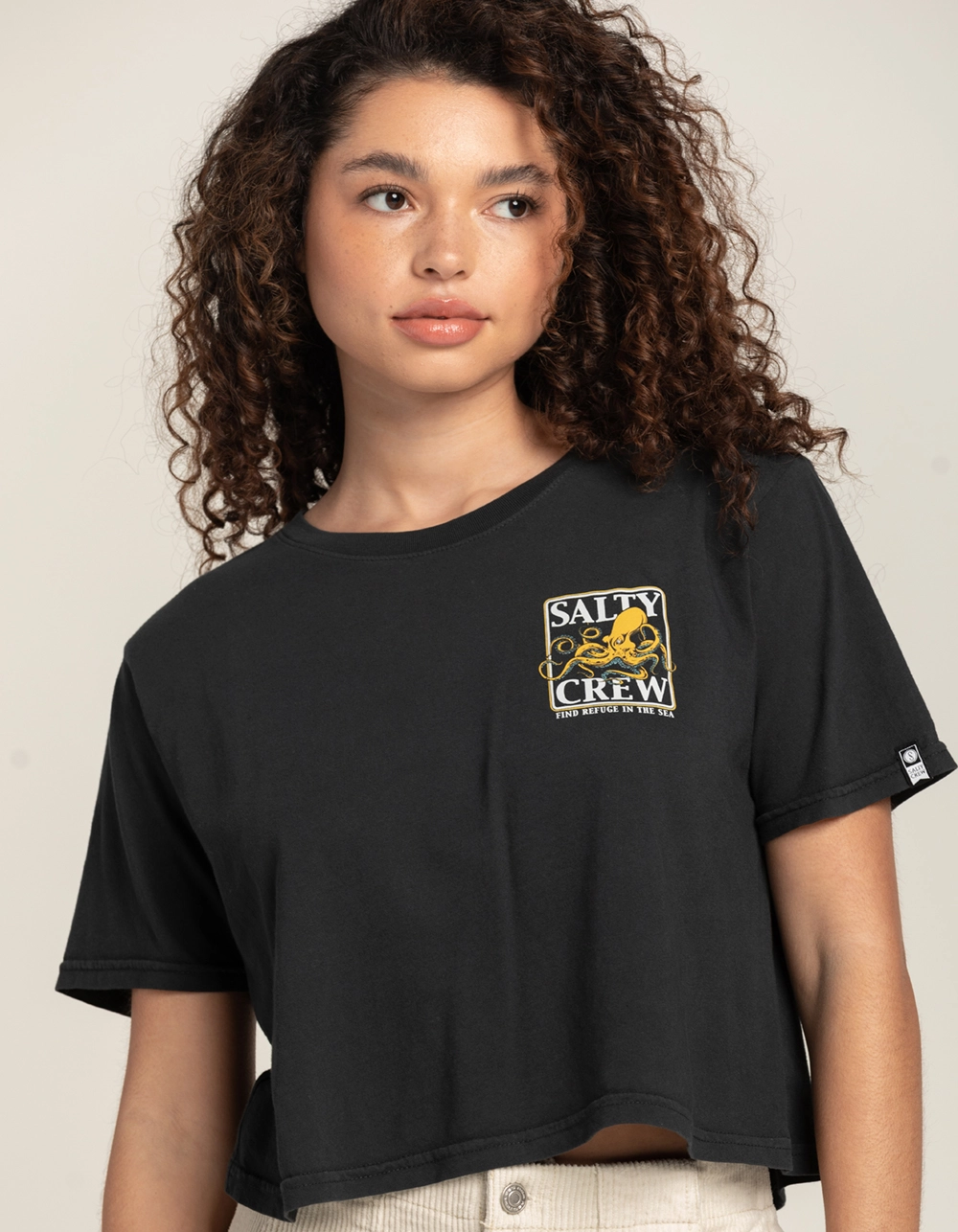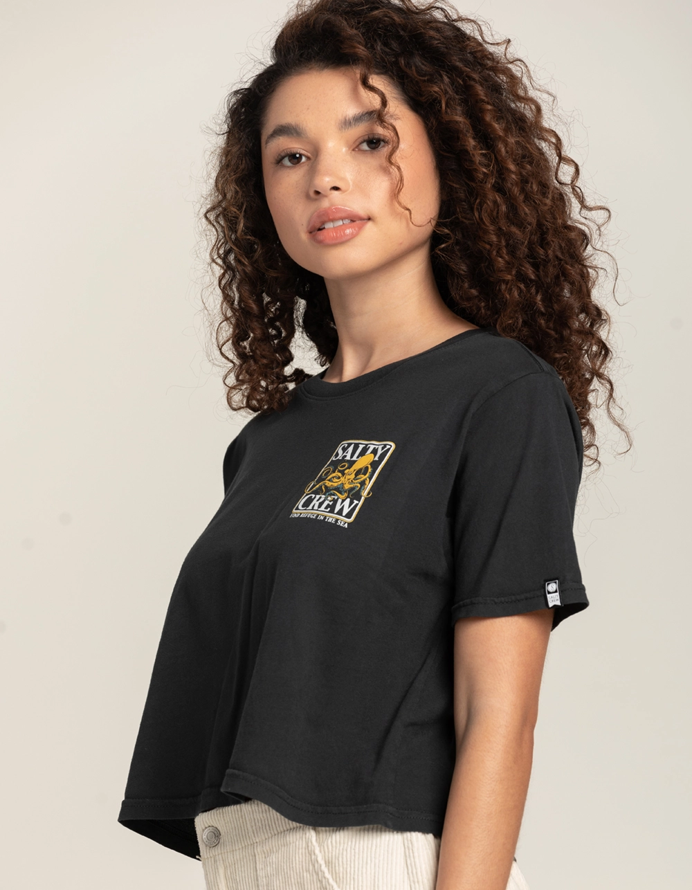 Salty Crew Ink Sling Tee. Logo graphic screened on left chest. Large graphic on back. Ribbed crew neckline. Short sleeve. Cropped. Loose fit. 100% Cotton. Machine wash. Imported.