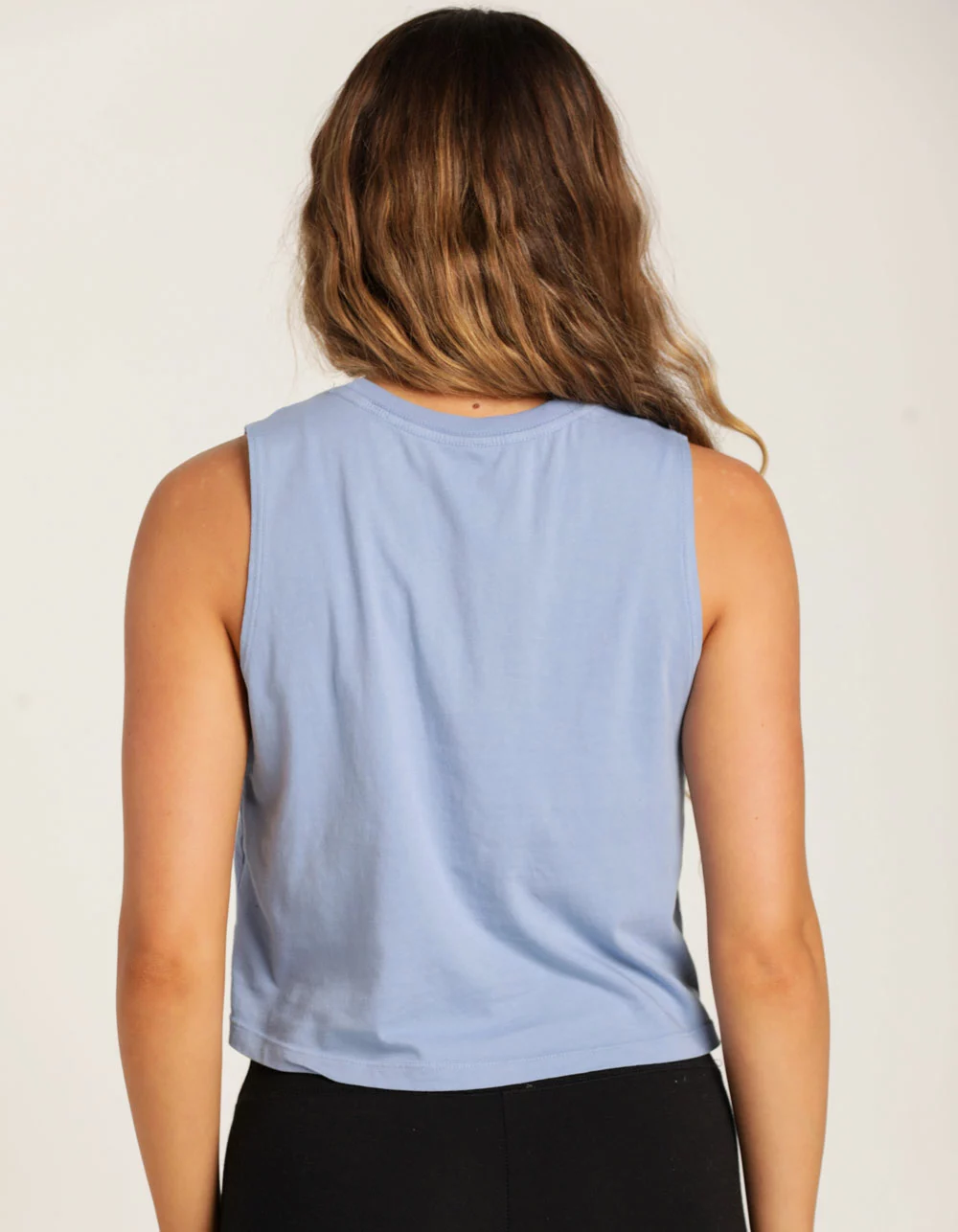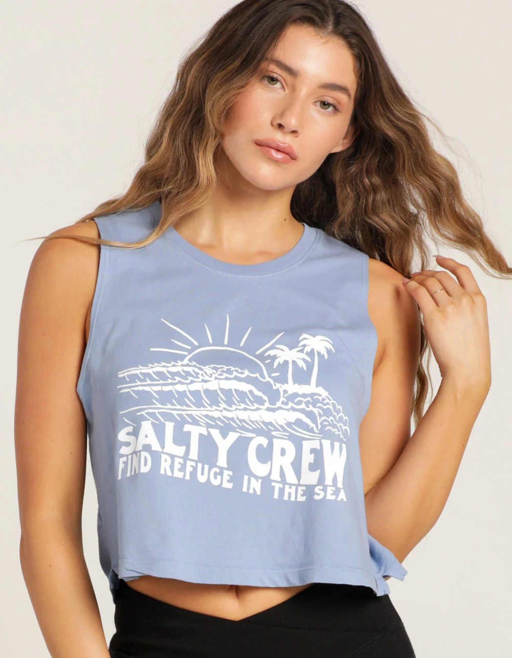 Salty Crew Cropped Muscle Tee. Large graphic on front. Ribbed scoop neckline. Sleeveless. 100% Cotton. Machine wash. Imported.