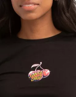 Santa Cruz Cherry Dot Cropped Tee. Graphic on front. Ribbed crew neckline. Short sleeves. Crop hem. 95% Cotton 5% Elastane. Machine wash. Imported.