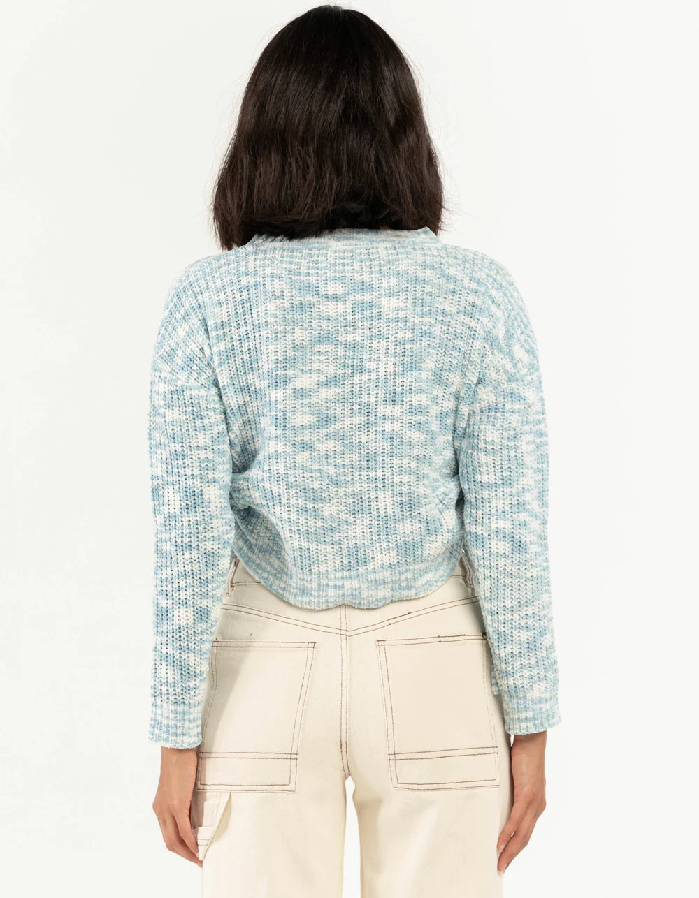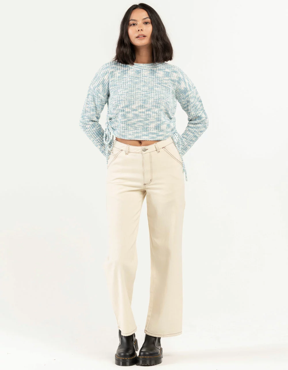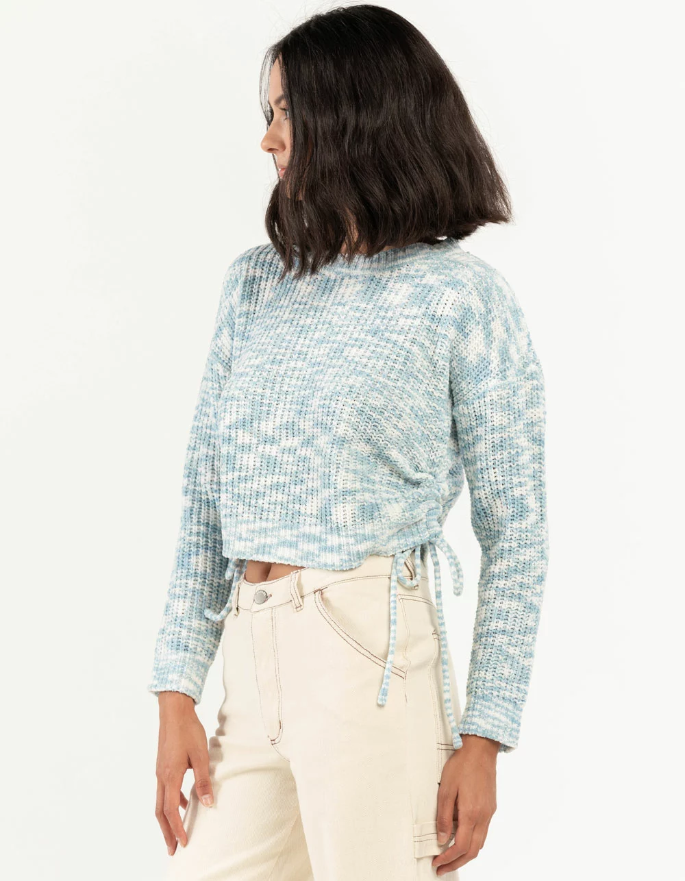 Say What Space Dye Side Cinch Sweater. Crew Neck Space dye design. Sweater Knit. Side cinch with self ties. Ribbed trim and cuffs. Crop hem. 100% Polyester. Machine wash. Imported.
