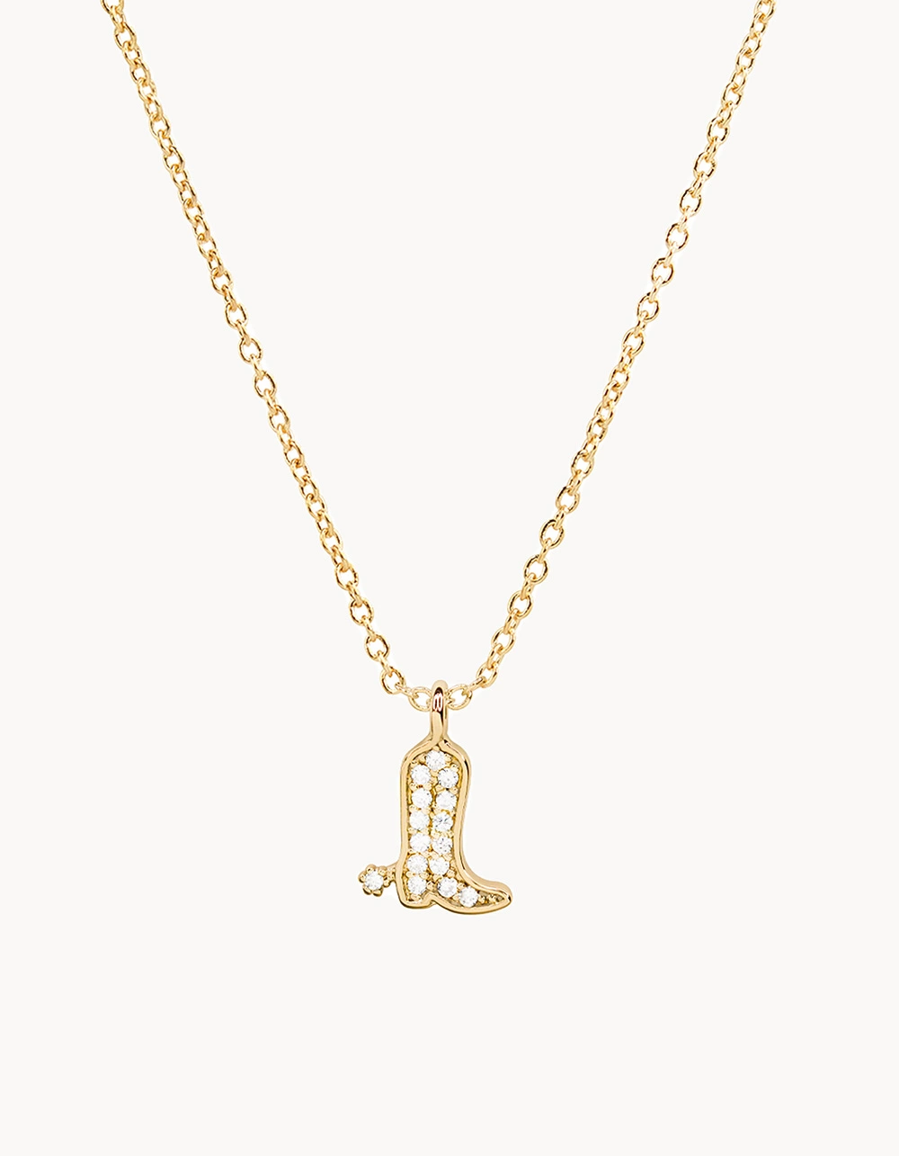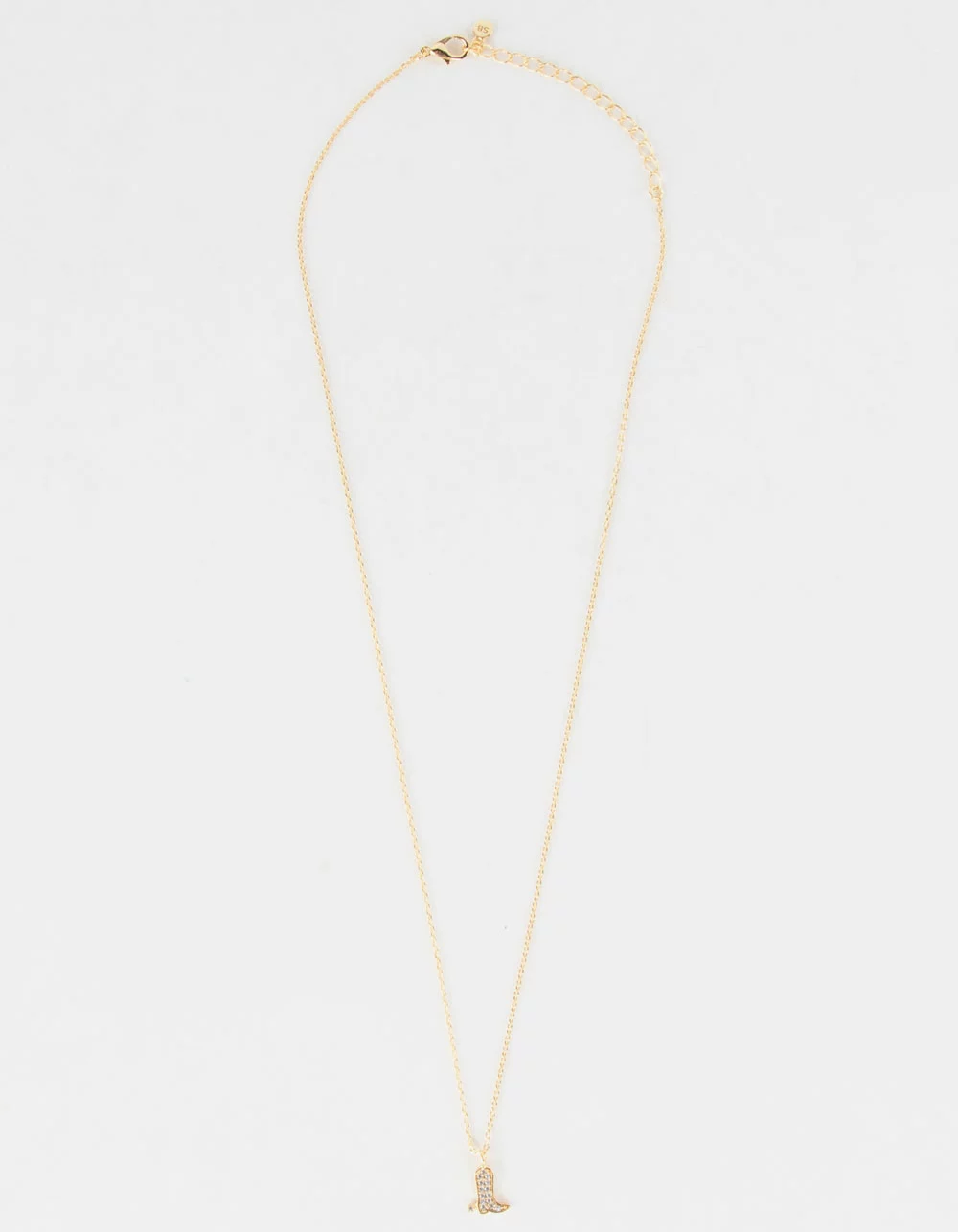 Secret Box New York 14K Gold Dipped Bling Boots Necklace. Dainty chain necklace. Western Boot pendant with rhinestone detailing. Lobster clasp closure. Length: 16.5″ + 2″inch extension. 14 karat gold dipped. Imported.