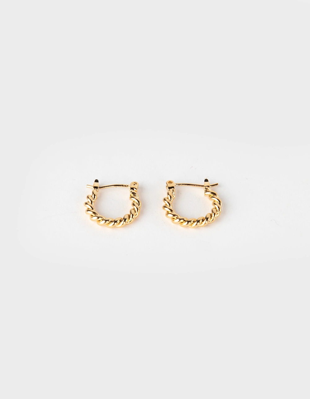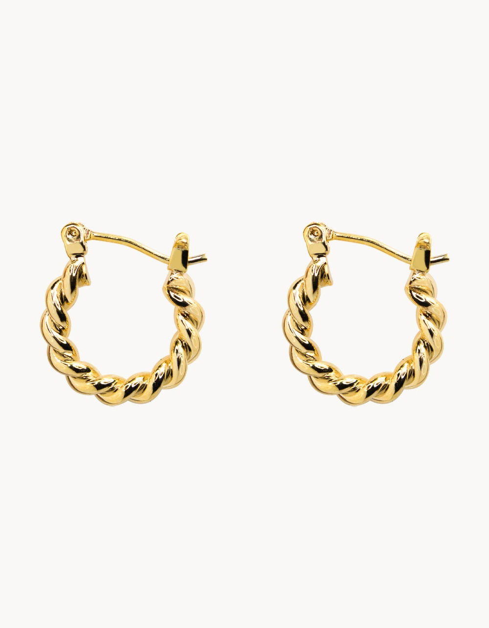 Secret Box New York 14K Gold Dipped Small Twist Earrings. Dainty twisted hoop earrings. Latch back closures. 14K gold dipped to prevent tarnishing. Imported.