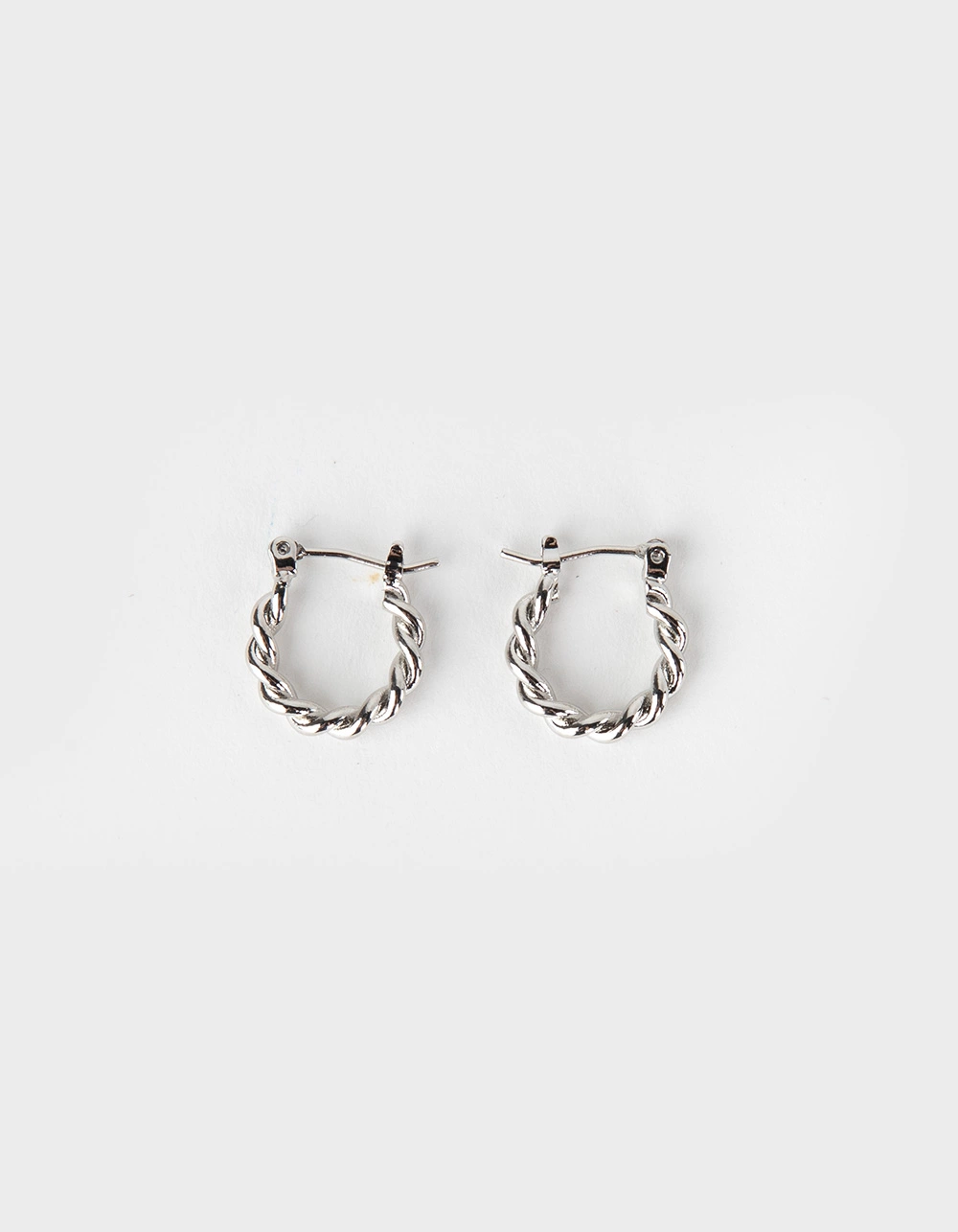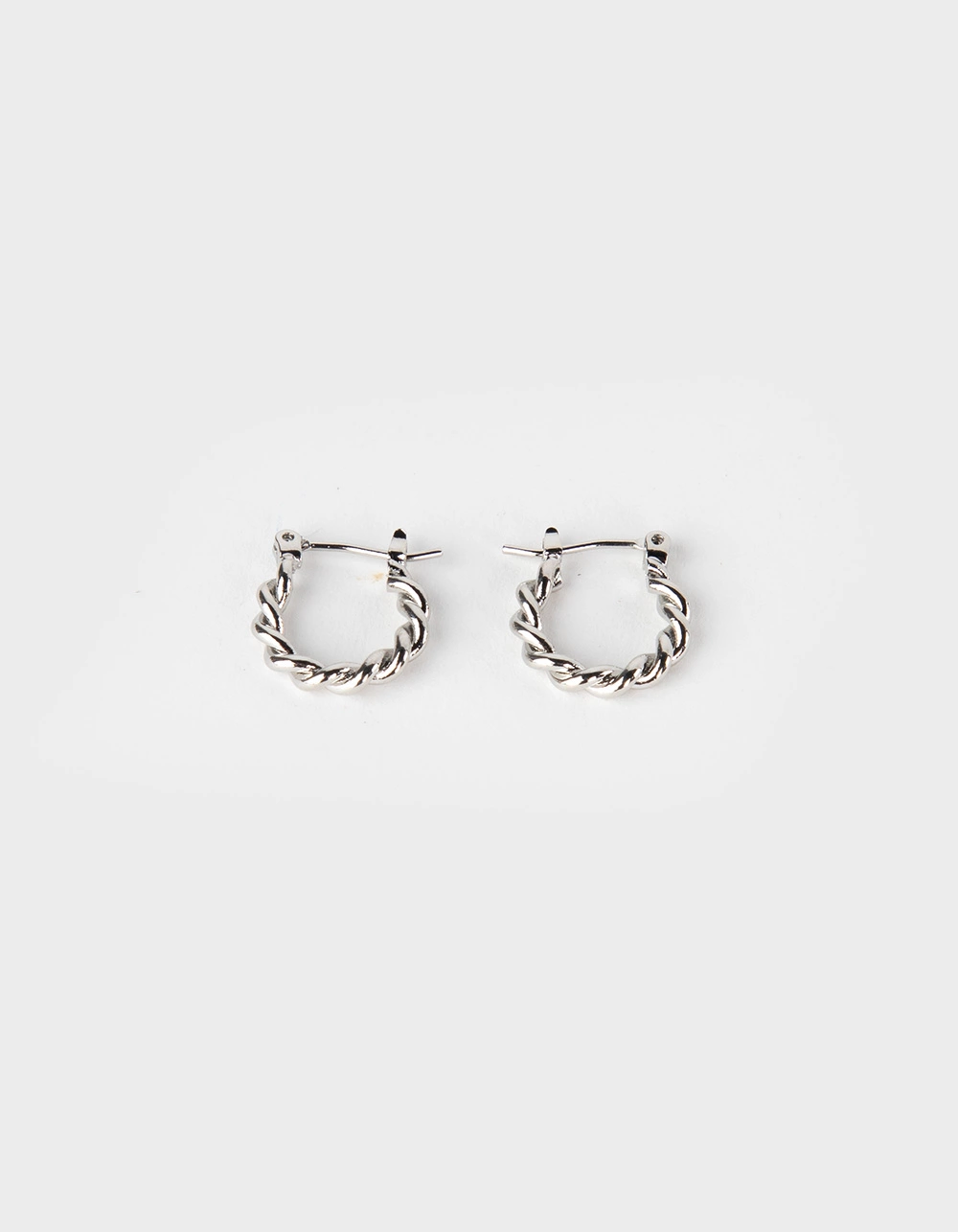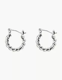 Secret Box New York Sterling Silver Small Twist Earrings. Dainty twisted hoop earrings. Latch back closures. Sterling silver dipped to prevent tarnishing. Imported.