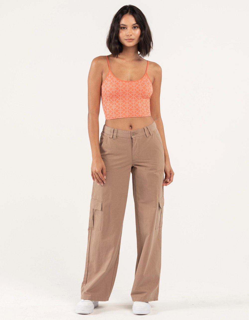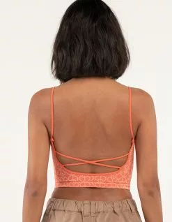 Sky and Sparrow Low Back Peace Bralette. All over print. Scoop neckline. Thin shoulder straps. Criss cross straps at low scoop back. Ribbed fabric. Fitted. 92% nylon/8% spandex. Hand wash. Made in USA.