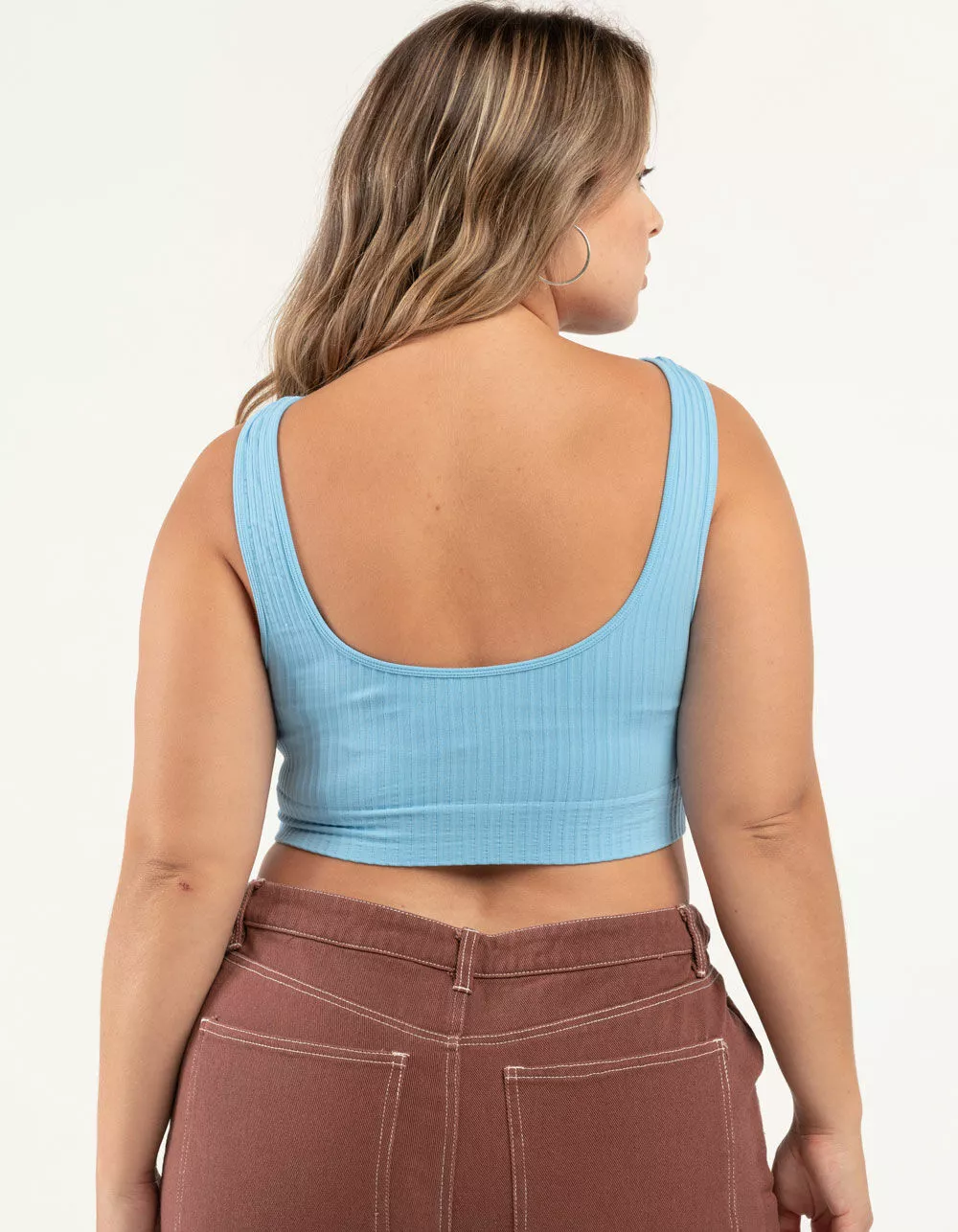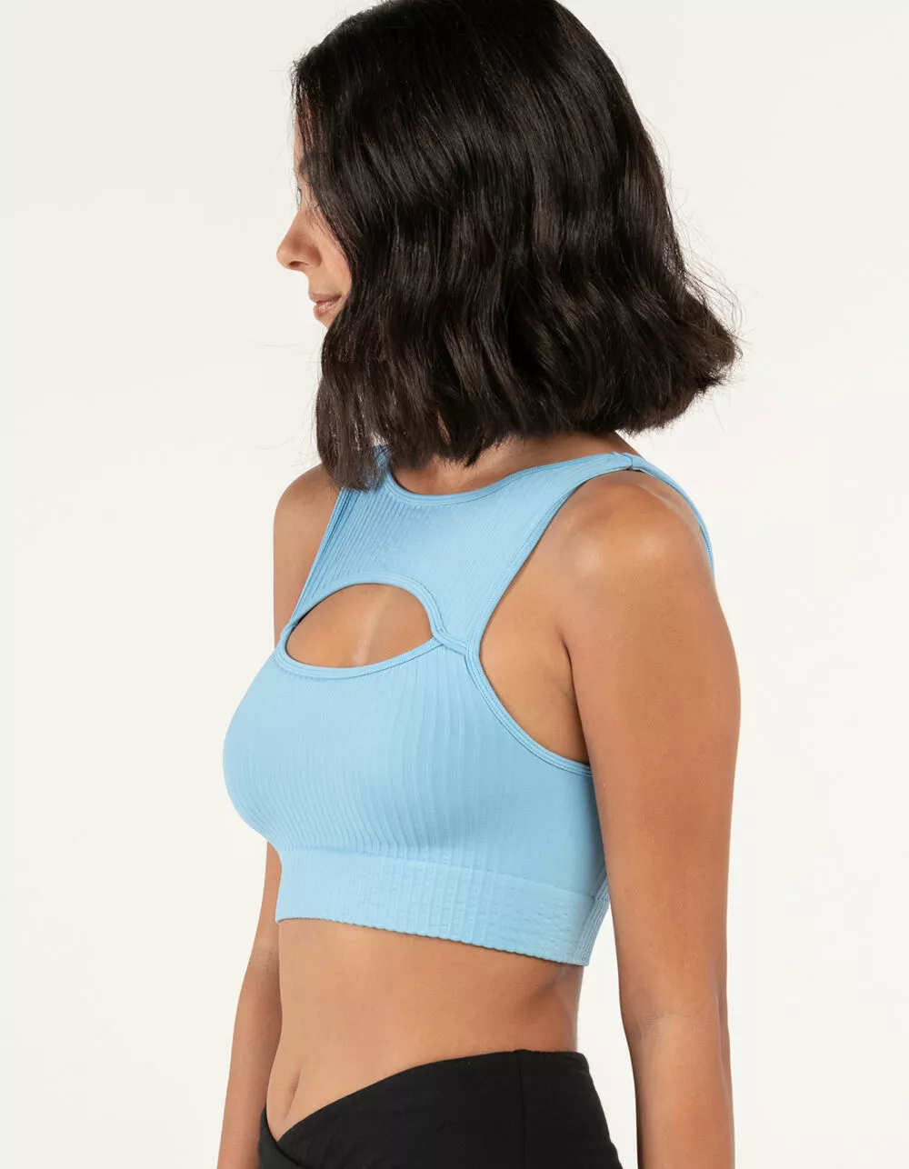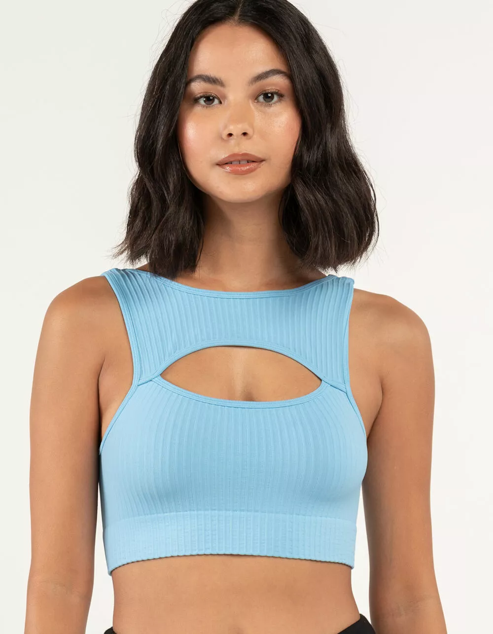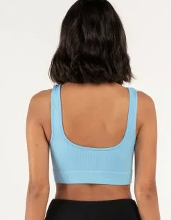 Sky & Sparrow Rib Cutout Bralette. Allover ribbed texture. Cutout front. Scoop neckline. Sleeveless. Low back. 92% Nylon 8% Spandex. Hand wash. Imported.