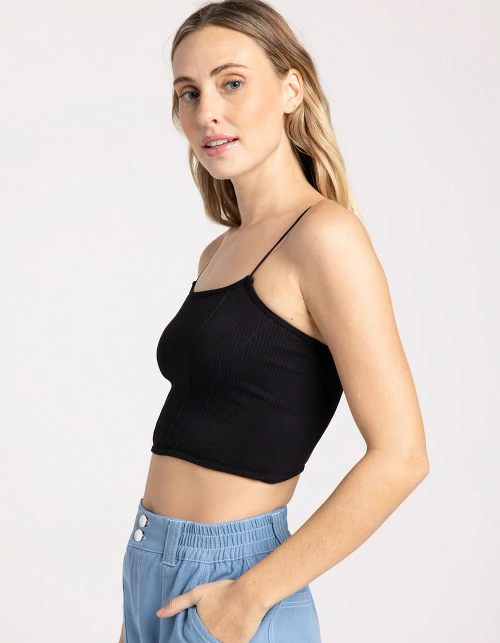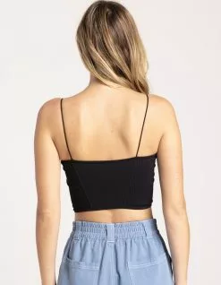 Sky & Sparrow Seamless Corset Top. Ribbed material. Corset style front. Spaghetti straps. Scoop neckline. Cropped fit. 92% Nylon. 8% Spandex. Hand wash. Made in U.S.A.