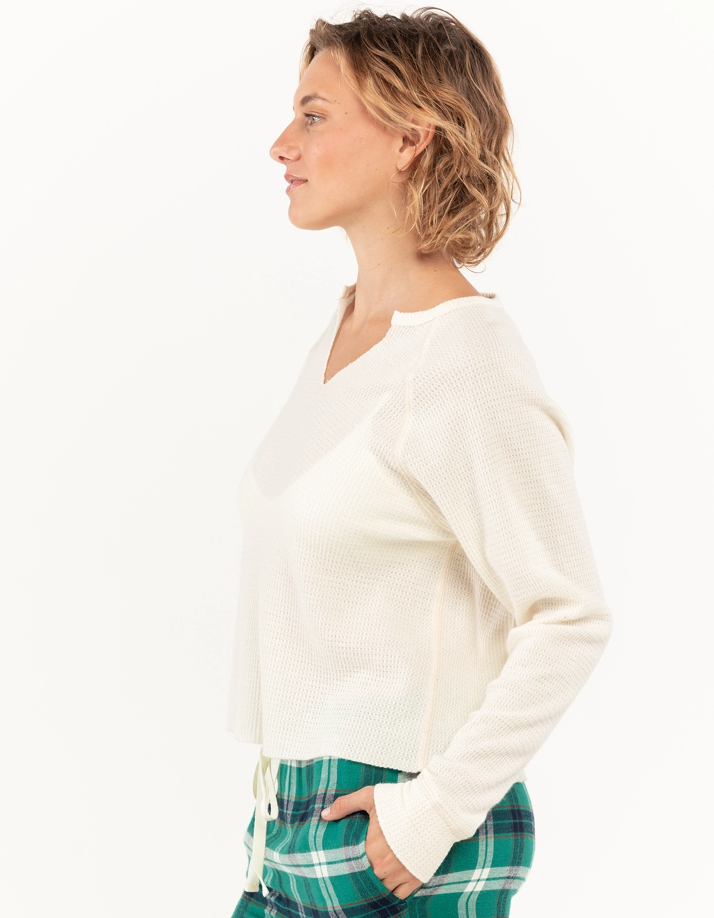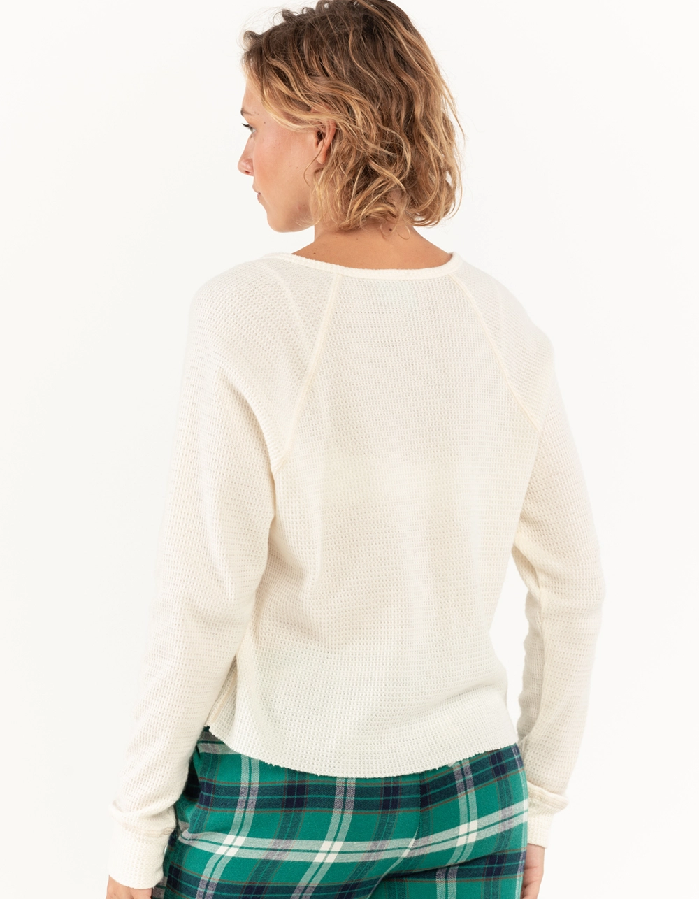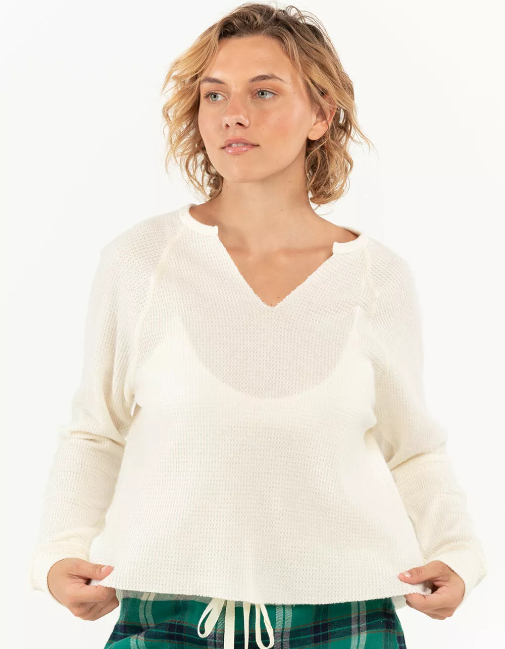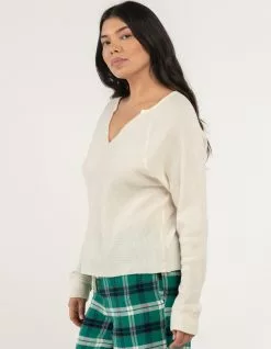 Sky & Sparrow Split Neck Thermal Pajama Top. Solid color. Long sleeves. Split neck. Thermal knit. Raw crop hem. 50% Cotton 50% Polyester. Hand wash. Imported.