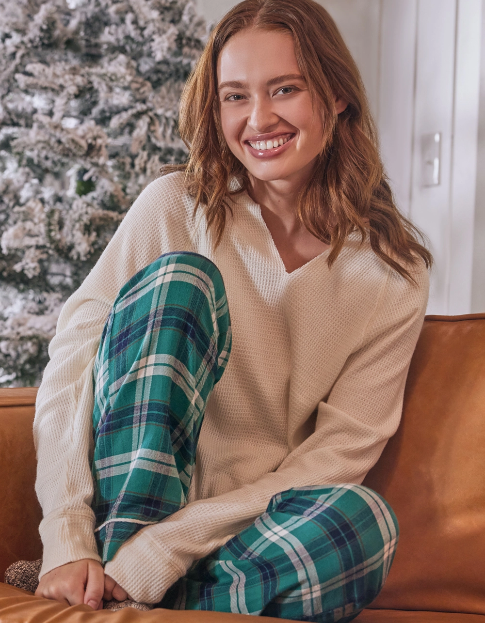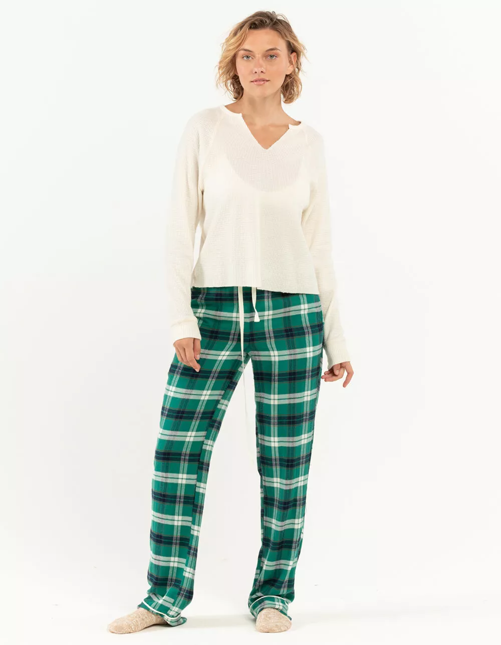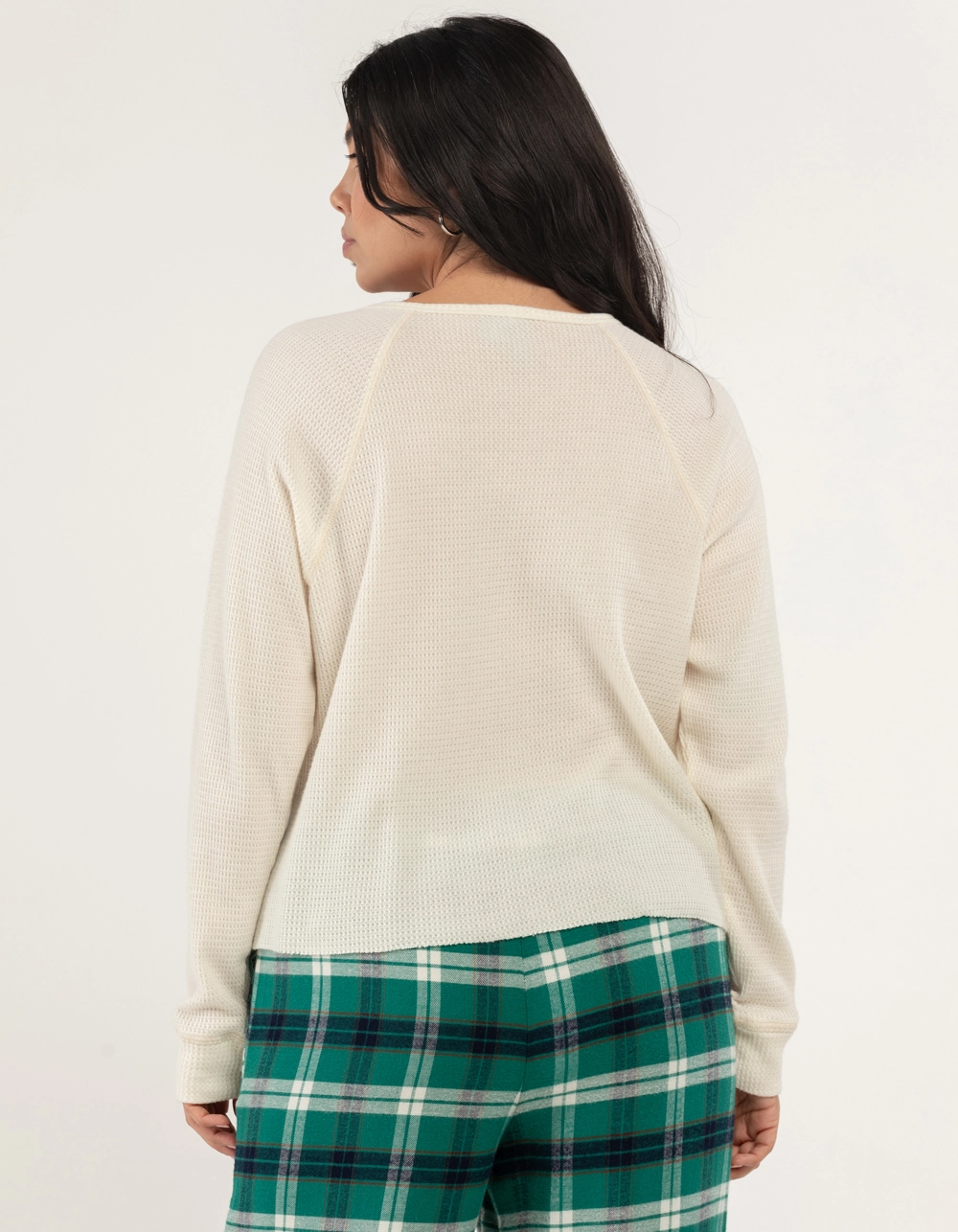 Sky & Sparrow Split Neck Thermal Pajama Top. Solid color. Long sleeves. Split neck. Thermal knit. Raw crop hem. 50% Cotton 50% Polyester. Hand wash. Imported.