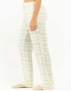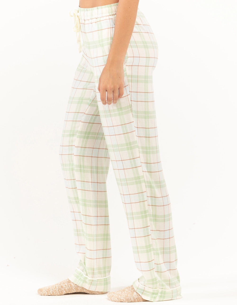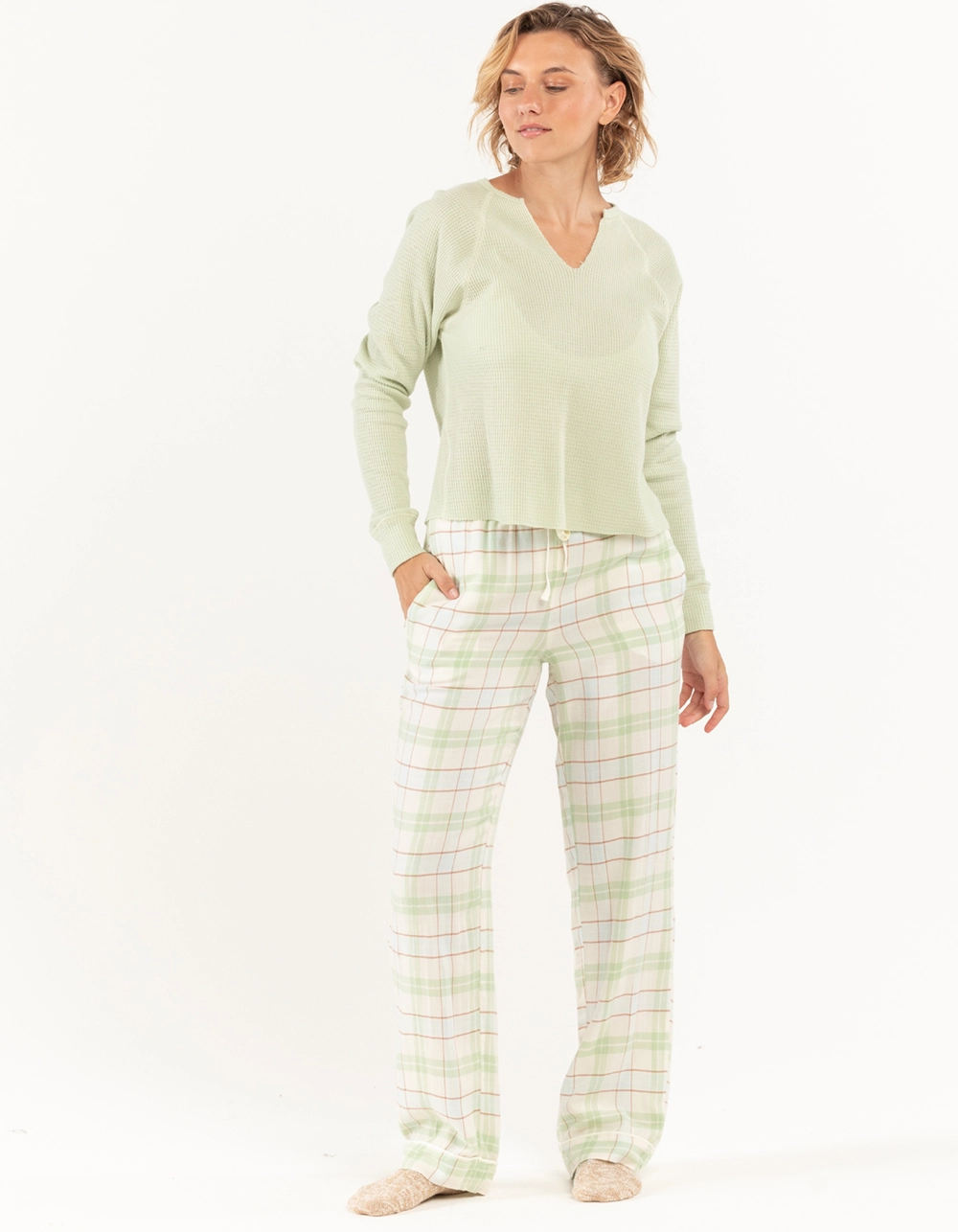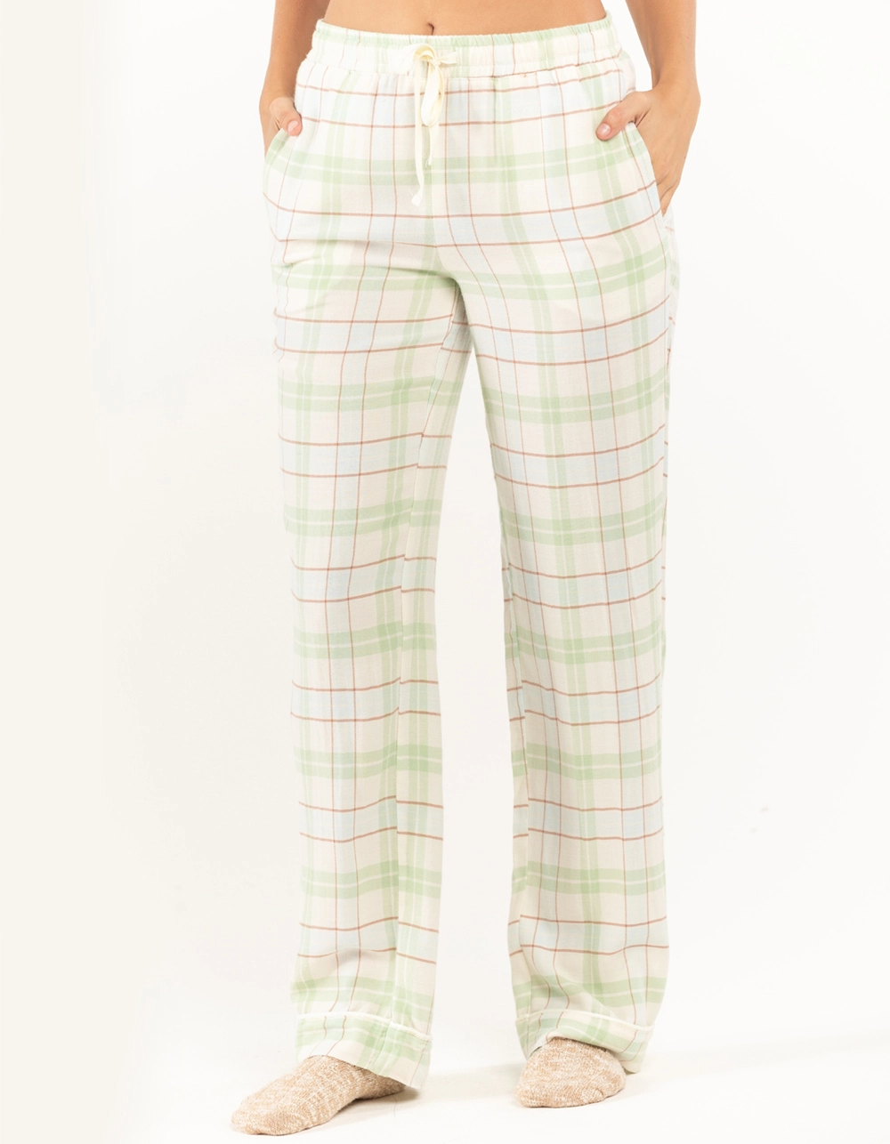 Sky & Sparrow Plaid Pajama Pants. Allover plaid pattern. Elastic waist with drawstring. Cuffed hem with rope trim. Side seam pockets. Approx. Inseam 31.5″. 50% Rayon 50% Cotton. Machine wash. Imported.