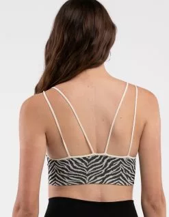 Sky & Sparrow Zebra Deep V Double Strap Bralette. Allover pattern. Ribbed fabric. Plunge deep V neckline. Elastic double shoulder straps. Wide hem. 92% Nylon 8% Spandex. Hand wash. Made in USA.