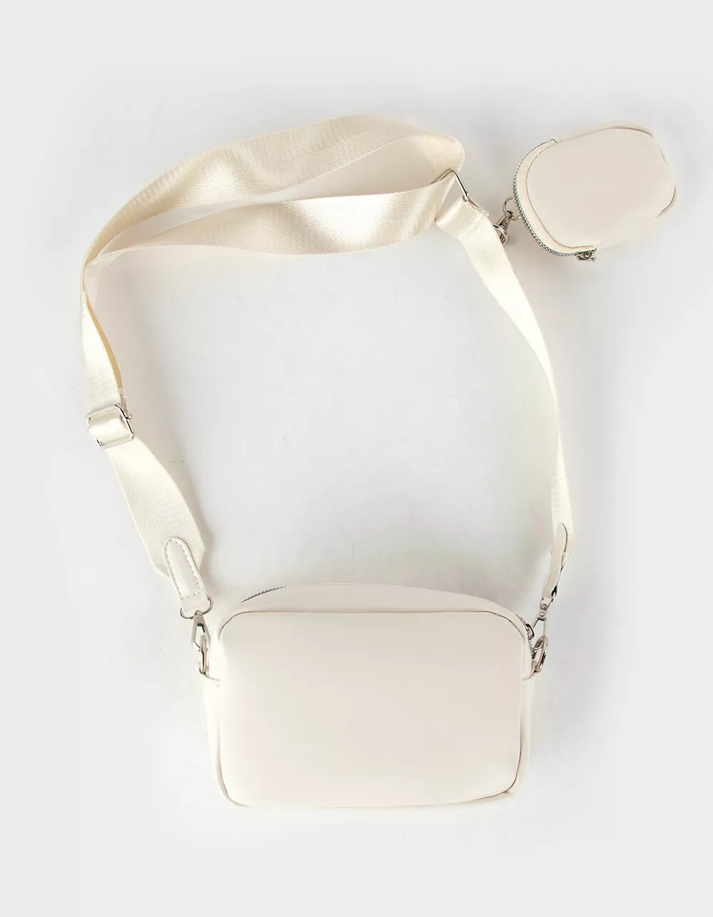 Smooth Double Pouch Crossbody Bag. Smooth PU leather bag. Zipper closure with interior organizational pocket. Adjustable shoulder strap featuring a smaller second pouch. Perfect for storing small valuables for quick and easy access. 8” W x 5.5” L x 3” D. 100% PU leather. Wipe with a damp cloth. Imported.
