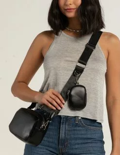 Smooth Double Pouch Crossbody Bag. Smooth PU leather bag. Zipper closure with interior organizational pocket. Adjustable shoulder strap featuring a smaller second pouch. Perfect for storing small valuables for quick and easy access. 8” W x 5.5” L x 3” D. 100% PU leather. Wipe with a damp cloth. Imported.