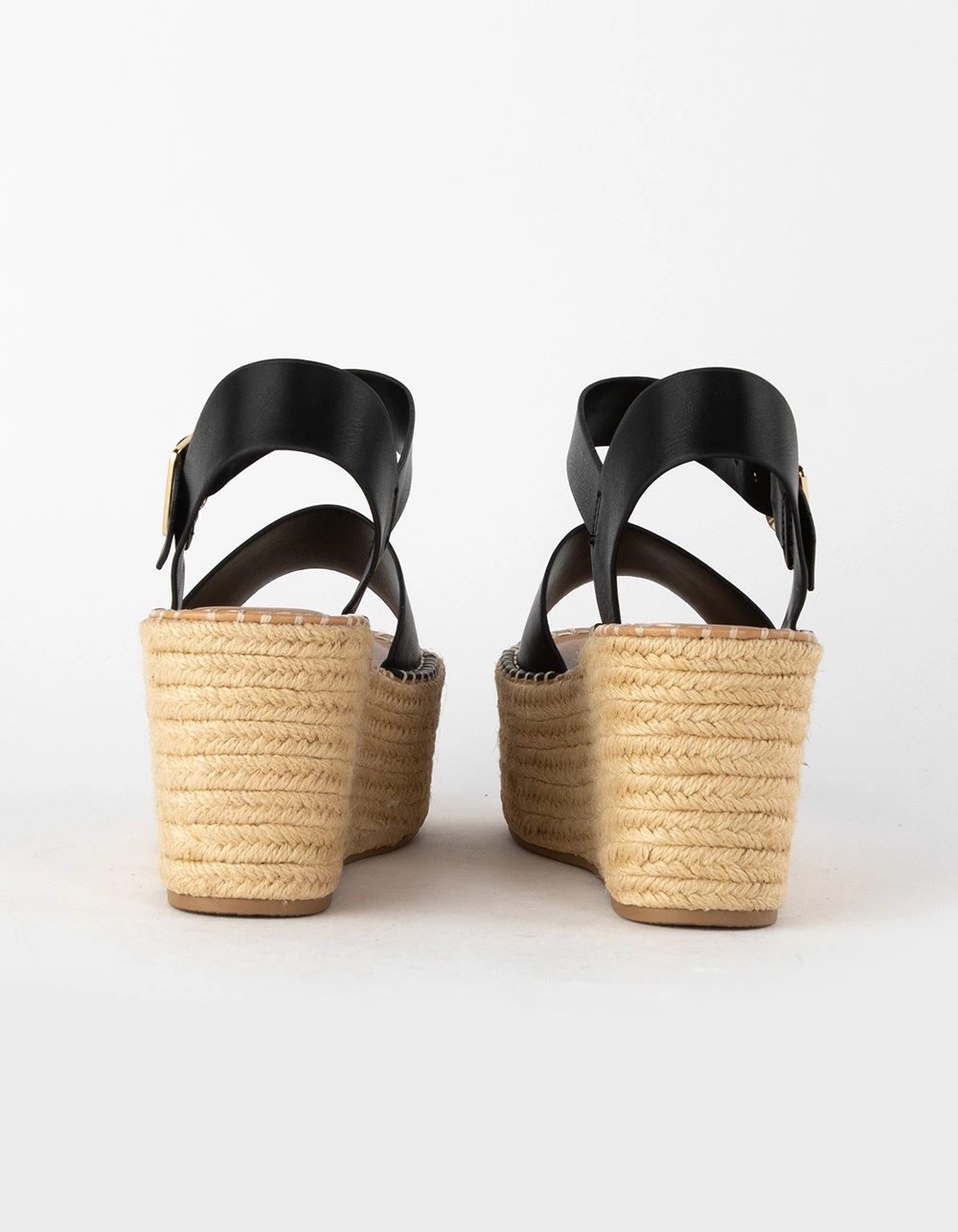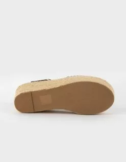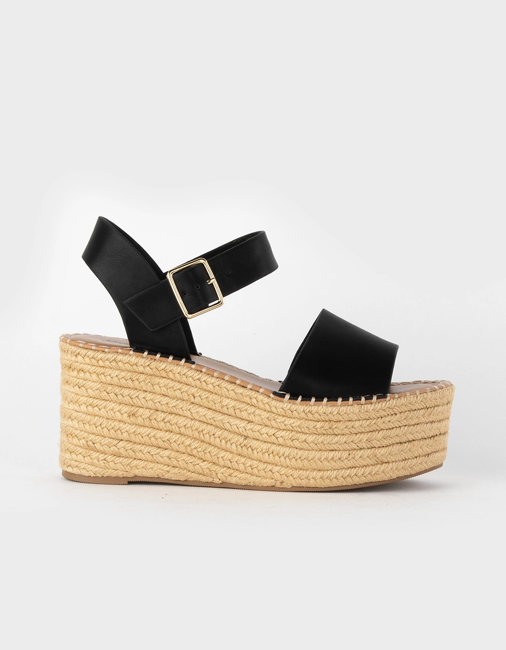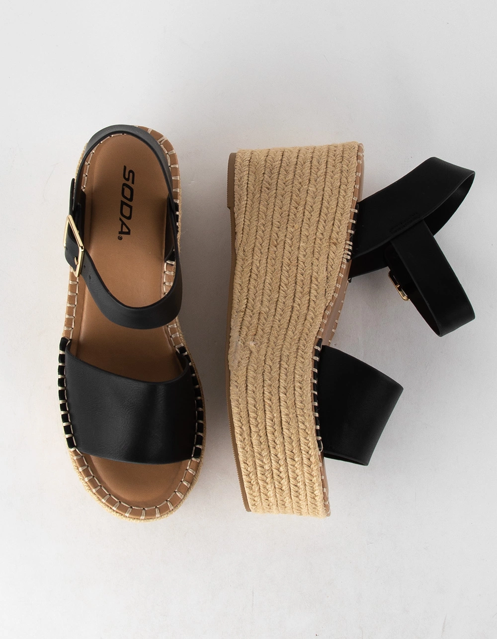 Soda Ankle Strap Espadrille heels. Features a faux leather upper. Adjustable buckle ankle strap. Platform espadrille sole. Synthetic rubber outsole. Approx heel height: 3.5″. Imported.
