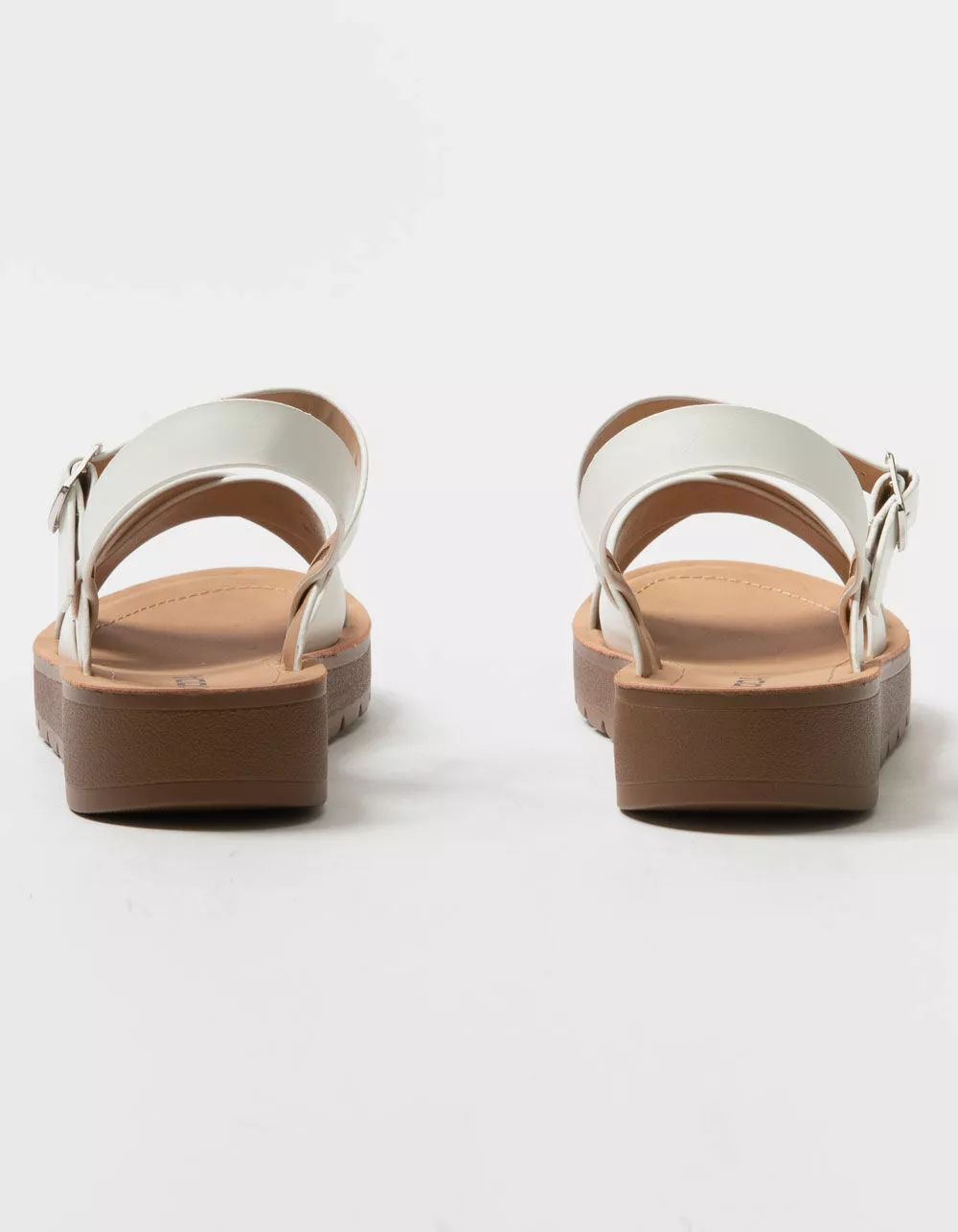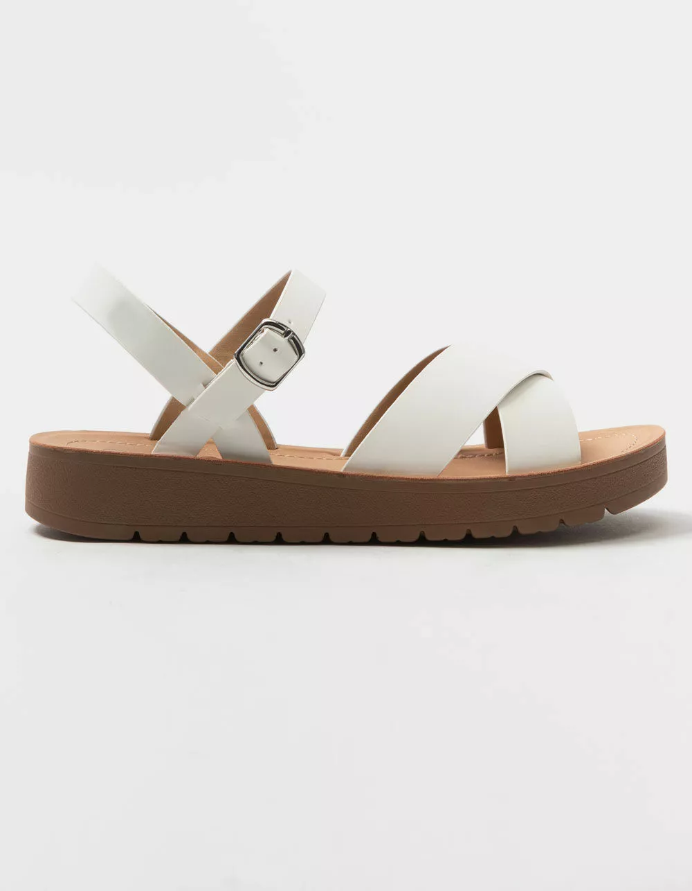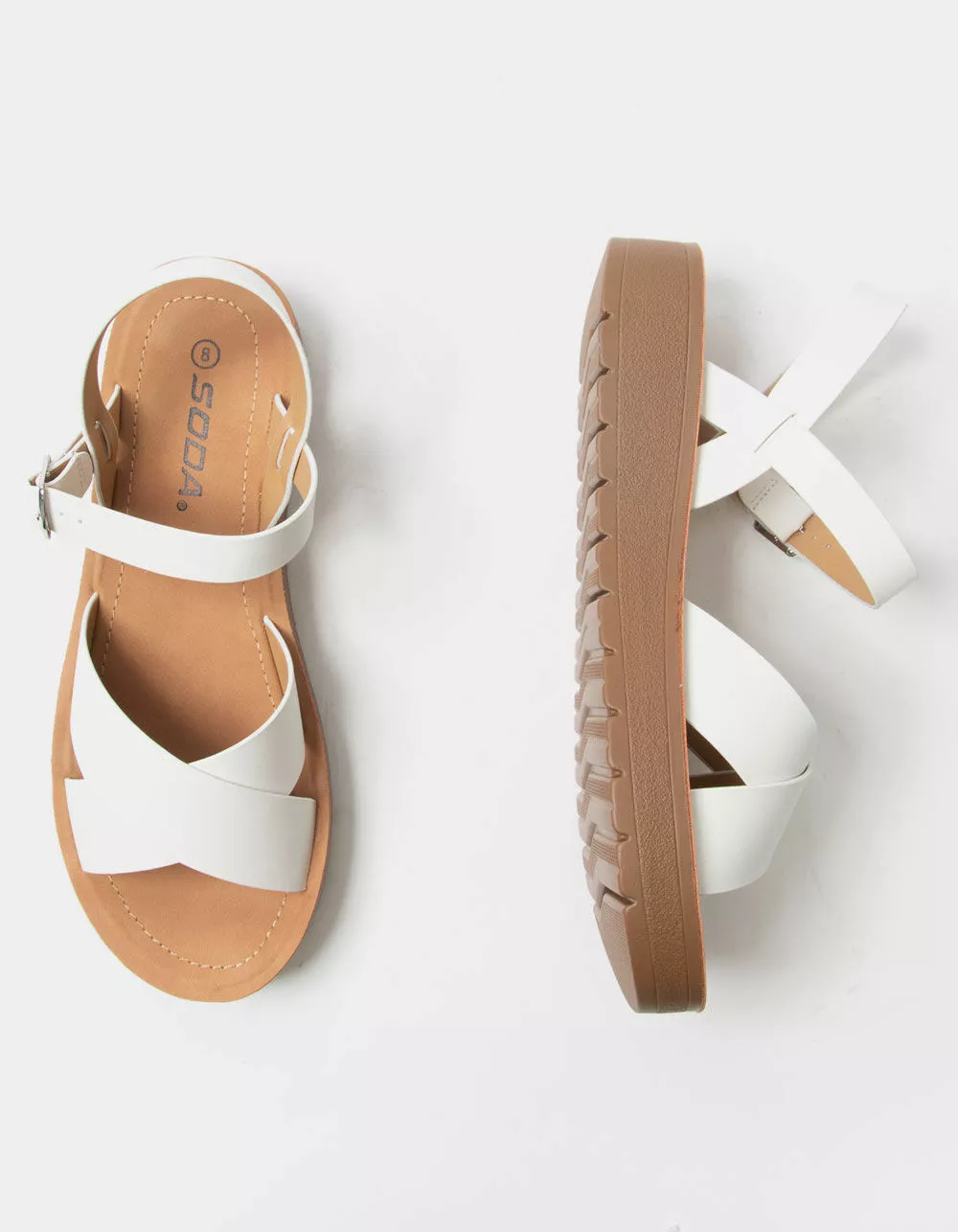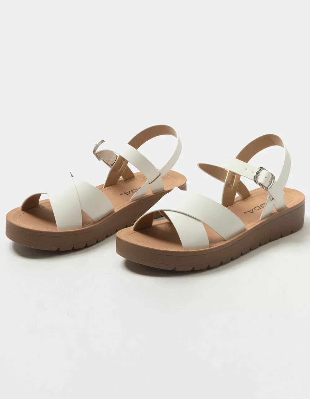 Soda Ankle Strap Mini Flatform Sandals. Faux leather upper. Crisscross toe straps. Ankle strap with buckle closure. Mini flatform outsole. Rubber sole. Padded footbed. Approx. platform: 1.25″. Imported.