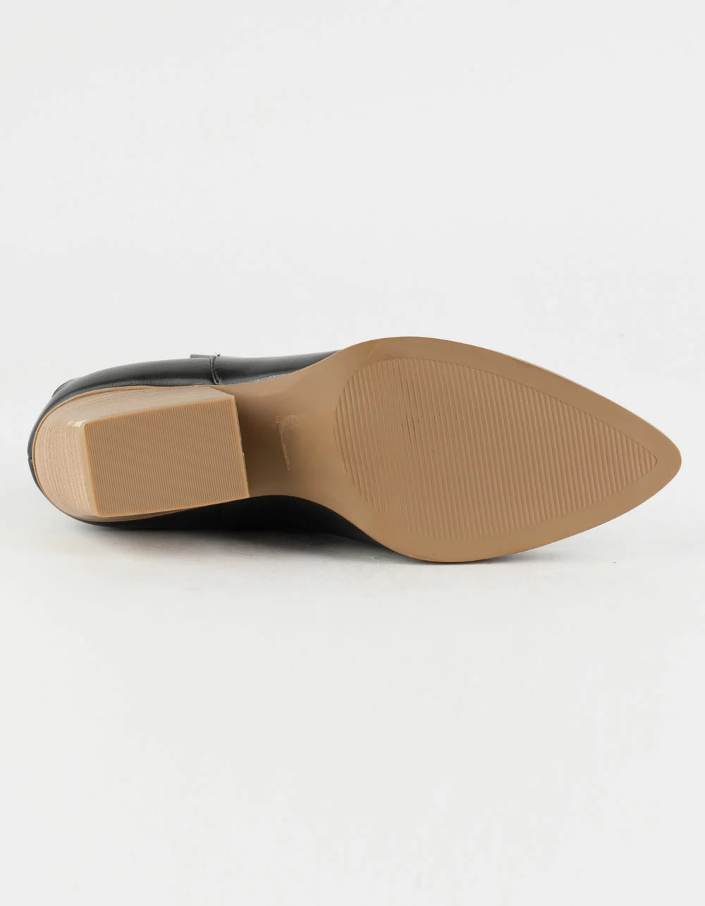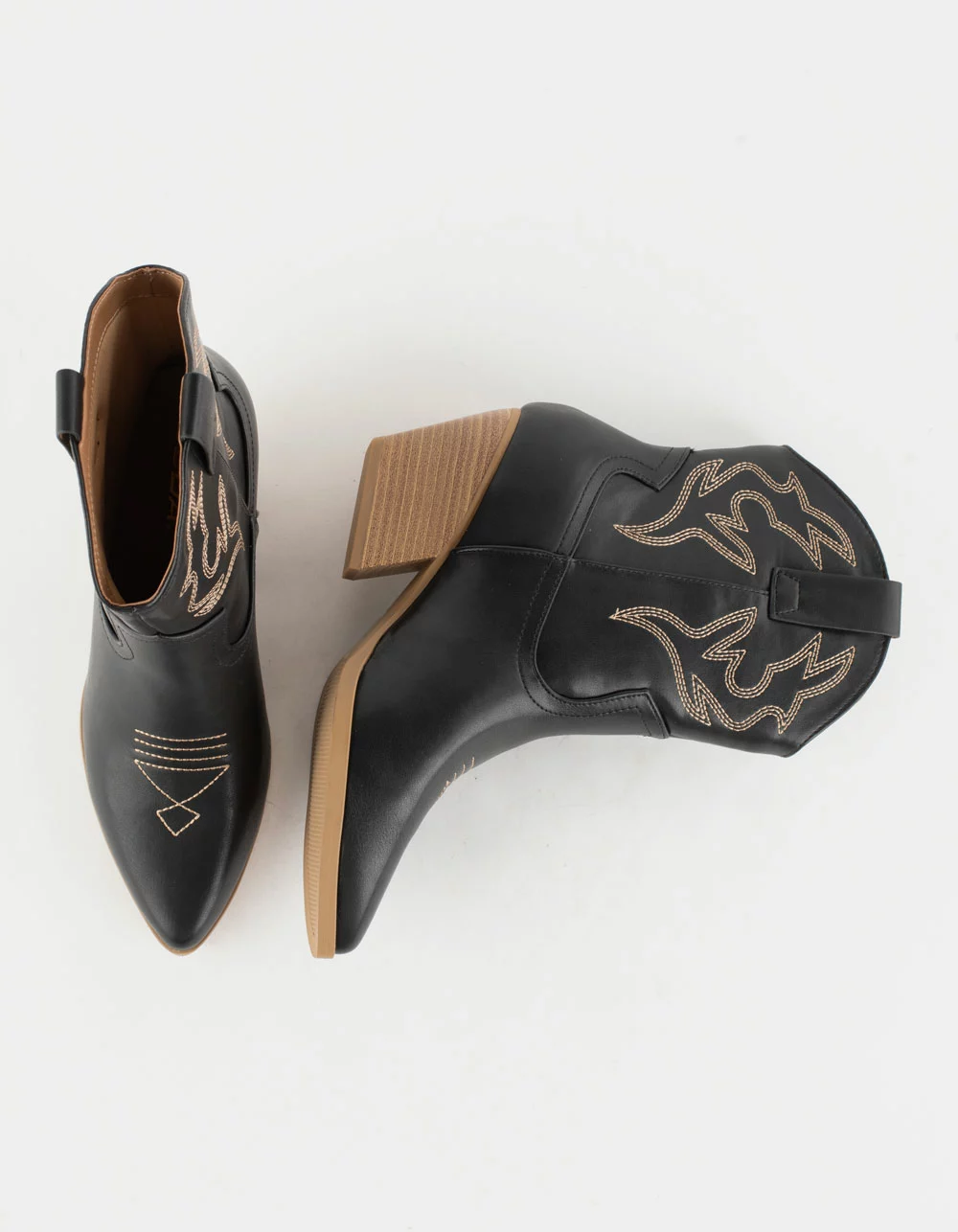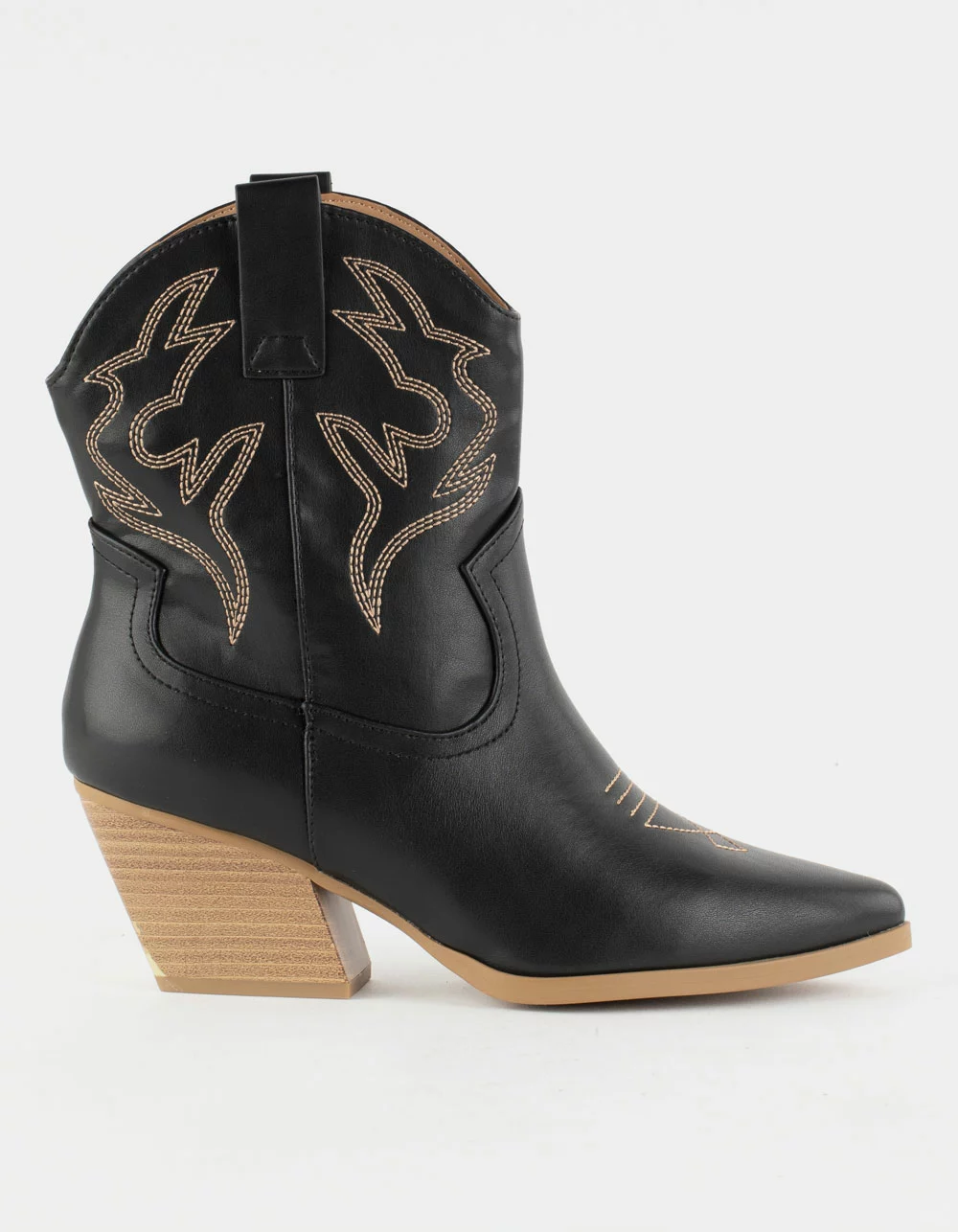 Soda Blazing Western Boots. Faux leather cowboy boots with stitch detailing. Pointed toe. Synthetic outsole. Stacked heel. Pull tabs for easy on/off. Approx. heel height: 2.75″. Imported.