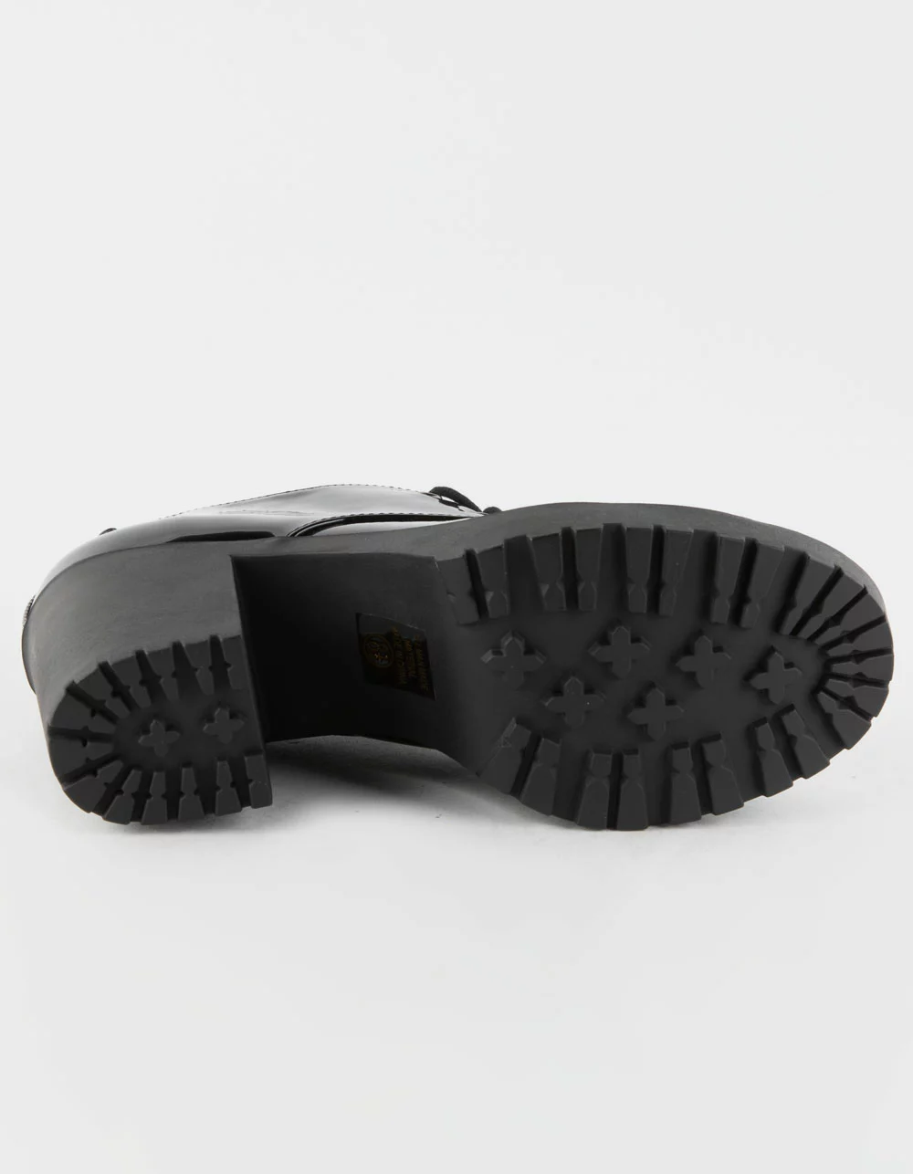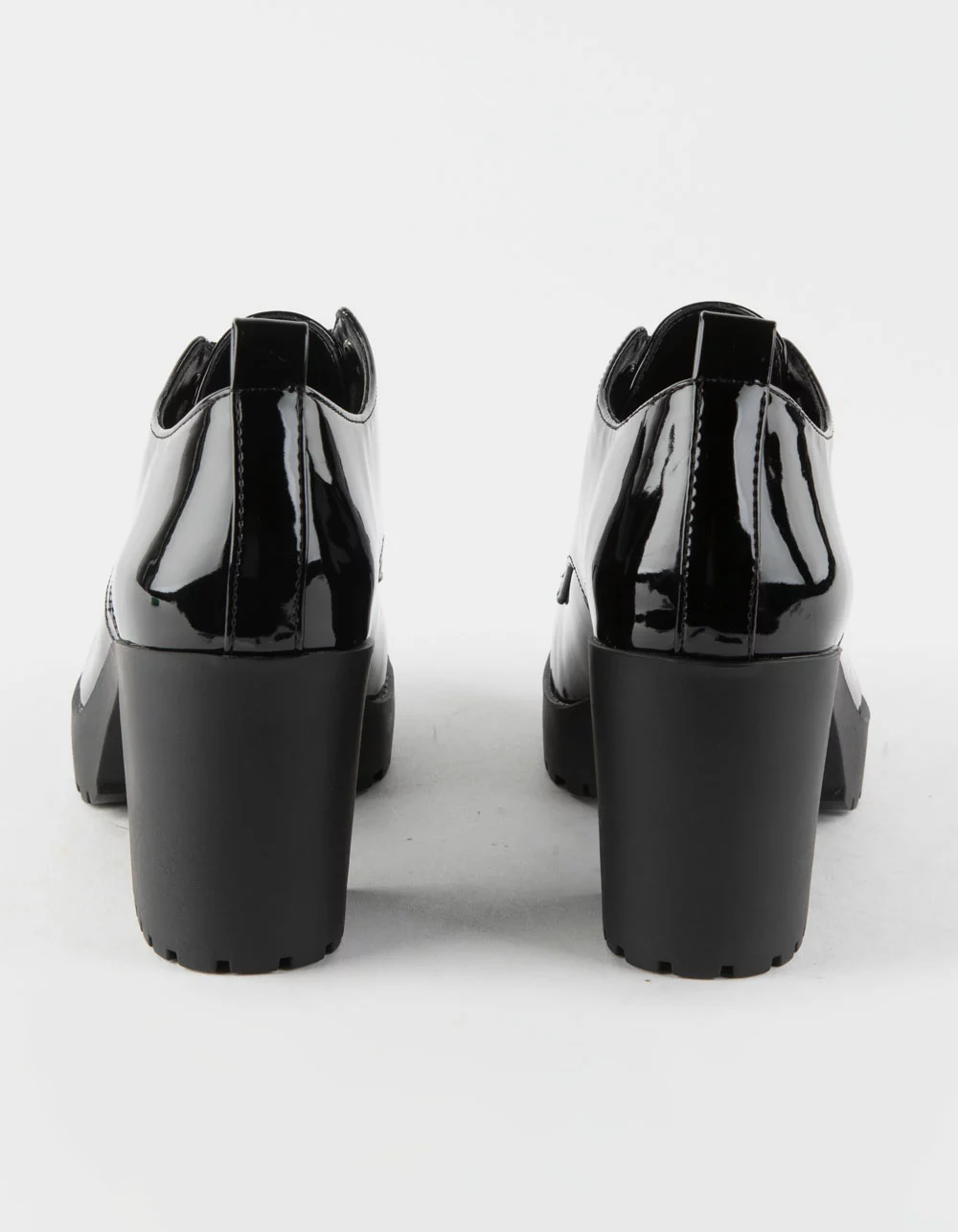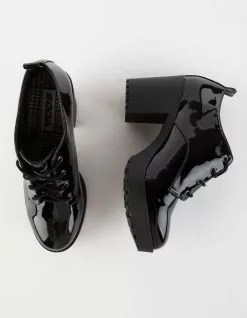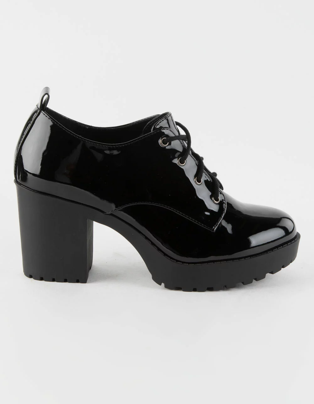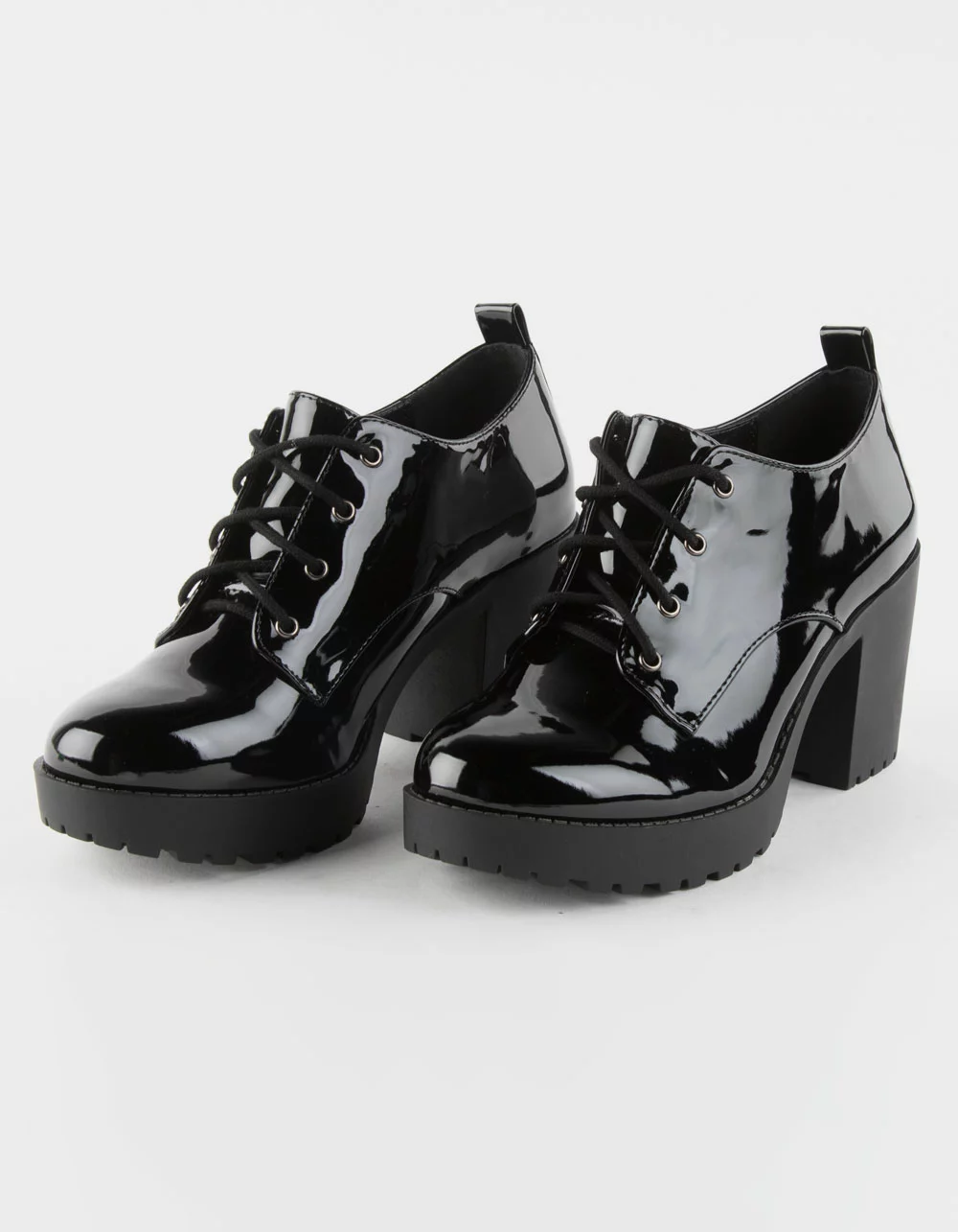 Soda Brief Lace Up Block Heel Shoes. Platform Shoes. Synthetic patent leather. Lace-up closure. Rubber lug sole. Padded insole. Heel tab. Approx. platform height: 1″. Block heel. Heel height: 3.25″ Imported.