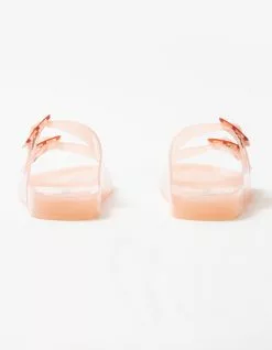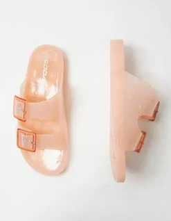Soda Buckle Jelly Slide Sandals. Translucent coloring. Jelly straps with an adjustable buckle. Flat Insole. Geometric Outsole. Open toe. Imported.