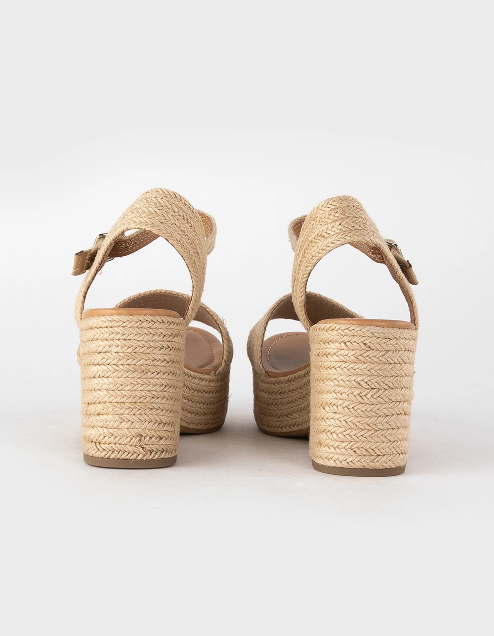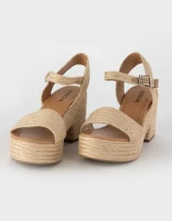 Soda Castle Platform Sandals. Jute wrapped faux leather straps. Comfort cushioned footbed. Adjustable ankle strap. Approximate heel height: 3 1/4″. Approximate platform height: 1 1/2″. Imported.