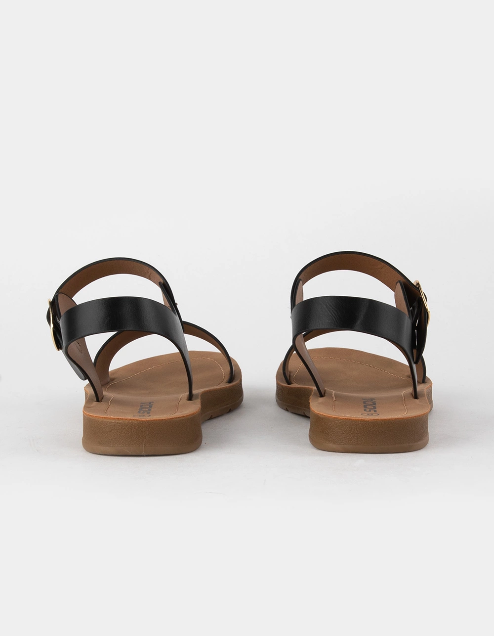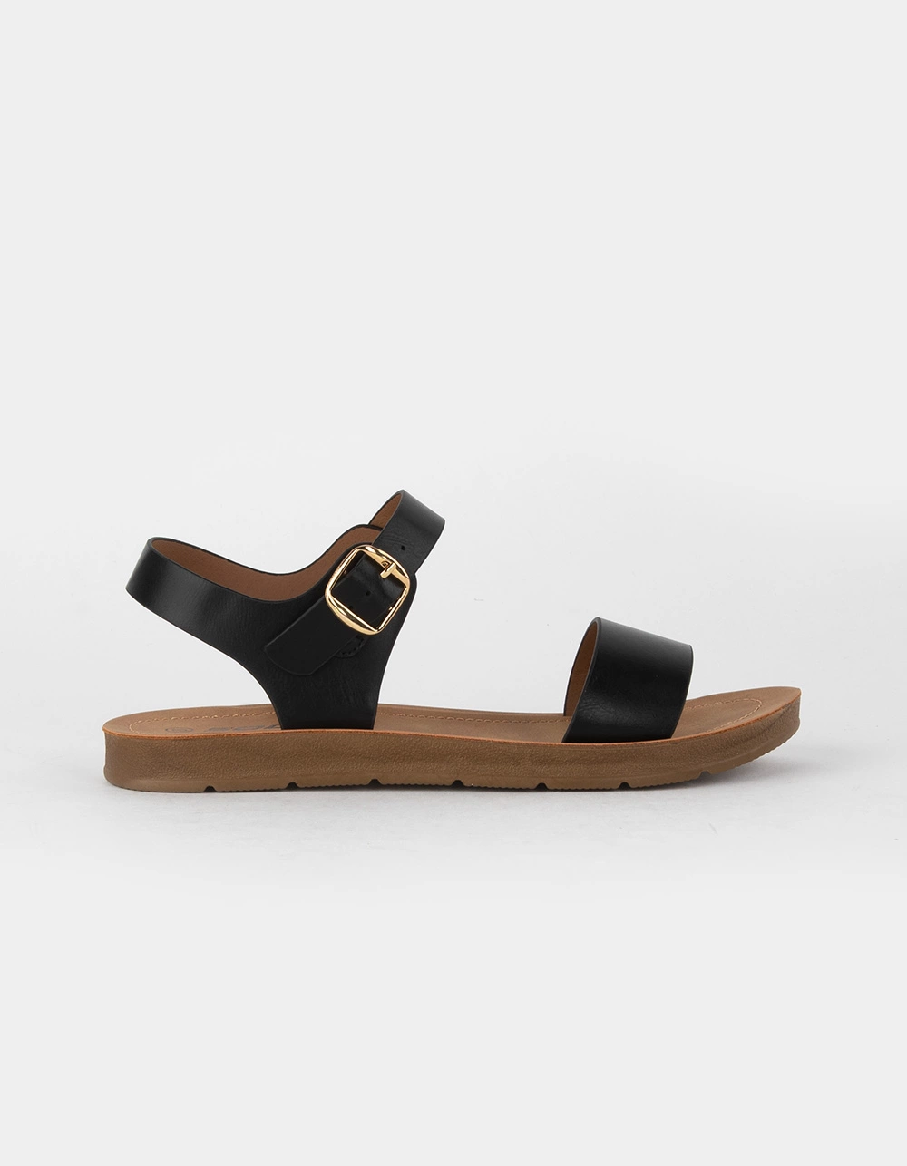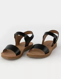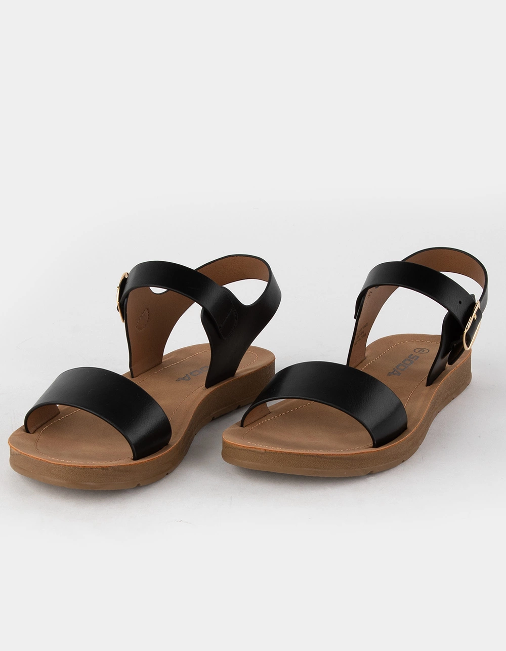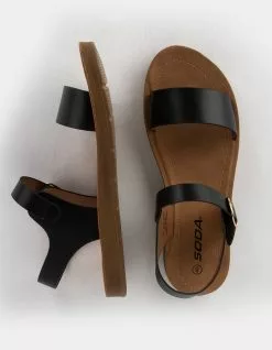 Soda Comfort Ankle sandals. Features a faux leather upper with an ankle strap and buckle closure. Cushion molded sole. Synthetic rubber outsole. Imported.