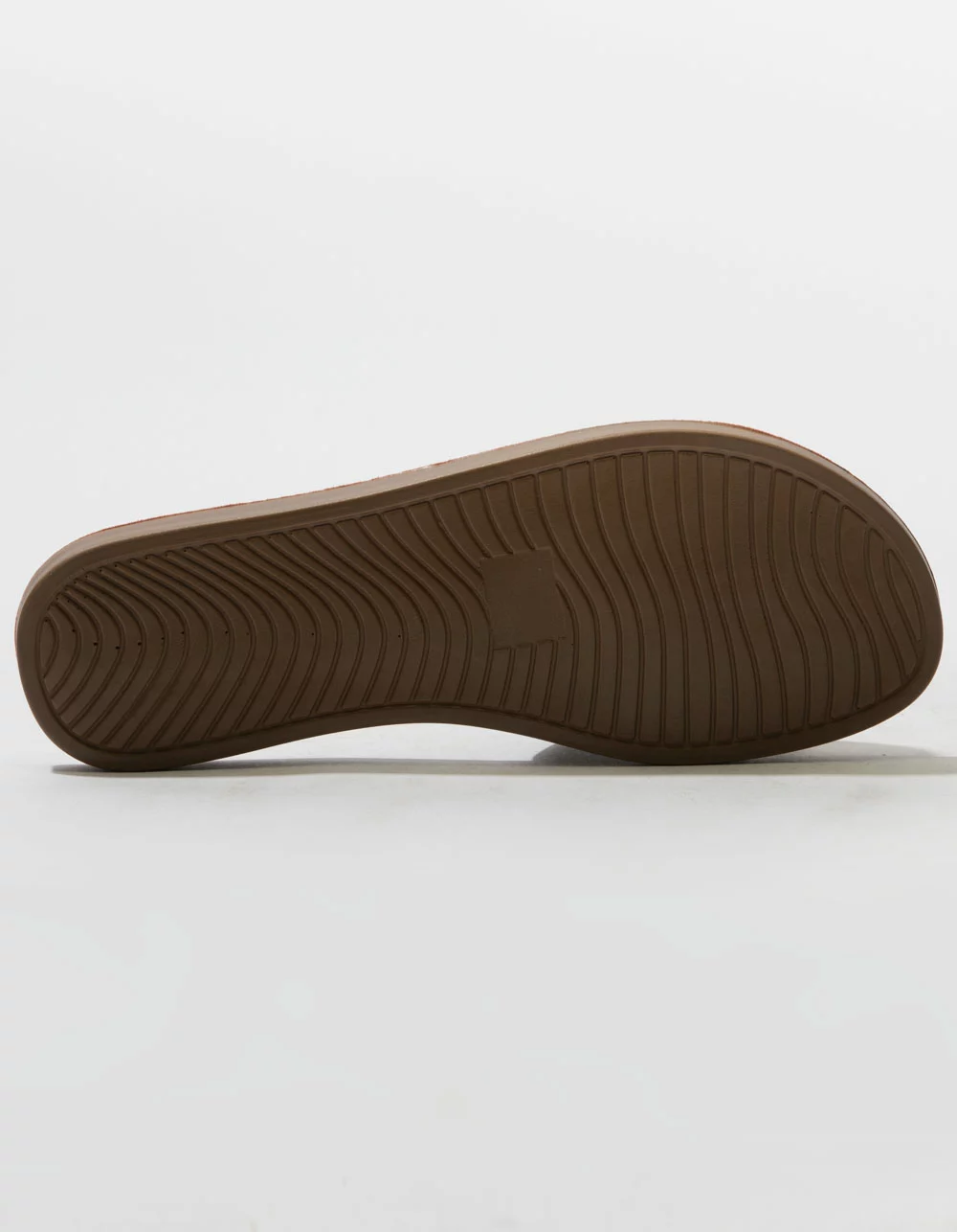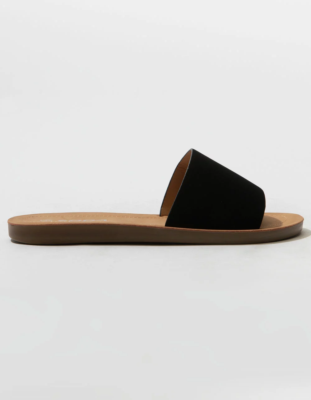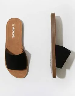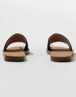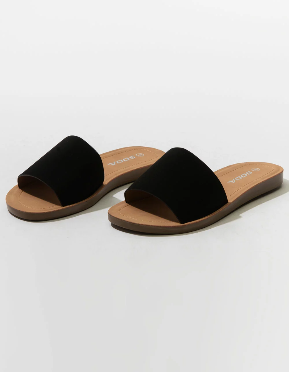 Soda Comfort Slide Sandals. Faux suede upper. Wide foot strap. Open toe. Soft, molded footbed. Rubber sole. Imported.
