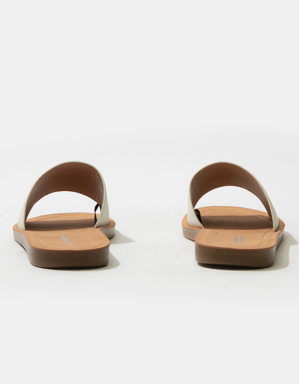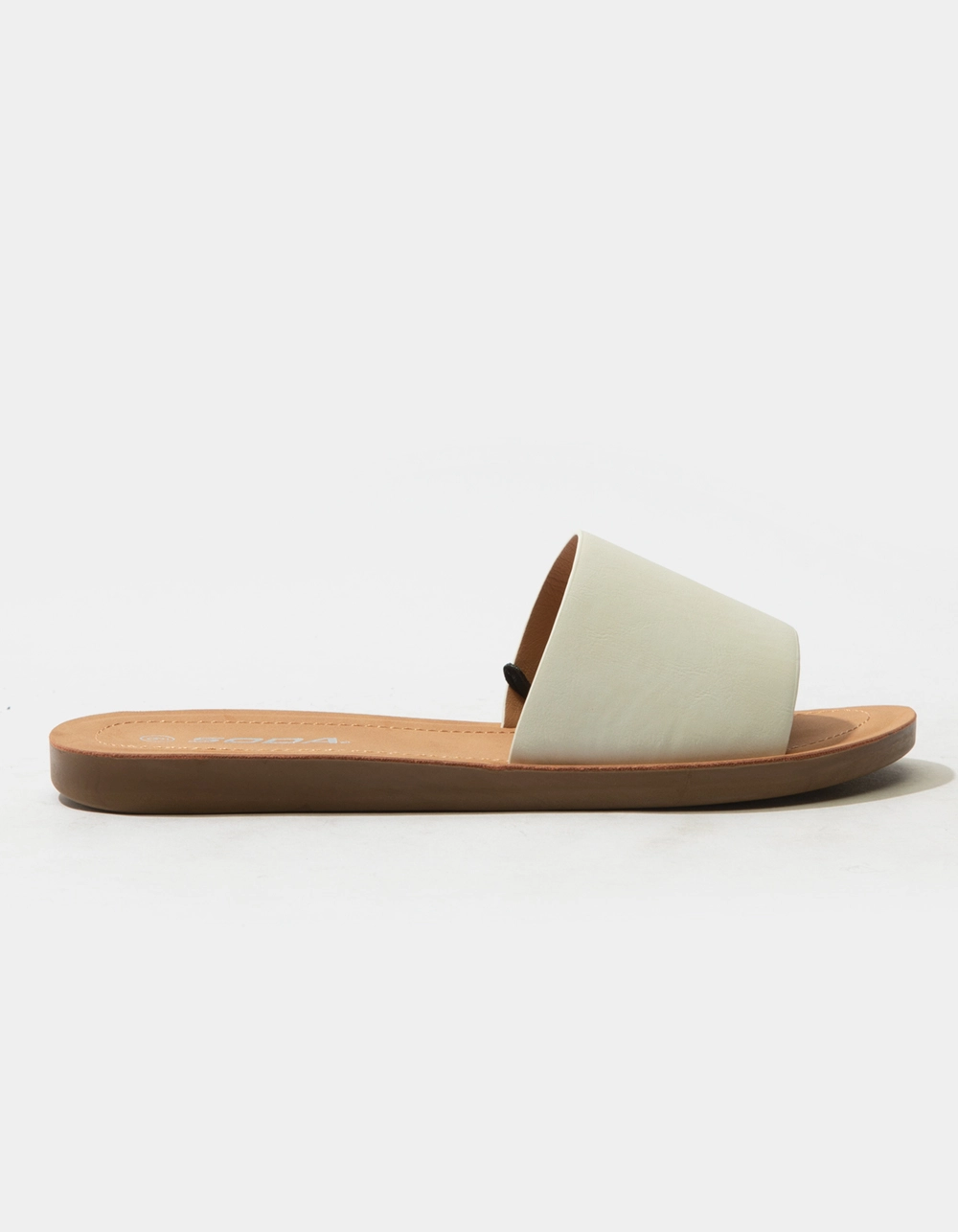 Soda Comfort Slide Sandals. Faux suede upper. Wide foot strap. Open toe. Soft, molded footbed. Rubber sole. Imported.